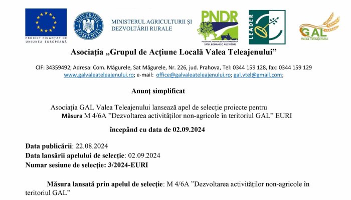Anunț simplificat - Măsura M 4/6A ”Dezvoltarea activităților non-agricole în teritoriul GAL” EURI începând cu data de 11.07.2024