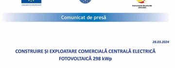 COMUNICAT DE PRESĂ | CONSTRUIRE ȘI EXPLOATARE COMERCIALĂ CENTRALĂ ELECTRICĂ FOTOVOLTAICĂ 298 kWp