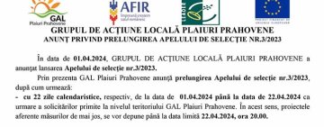 GRUPUL DE ACŢIUNE LOCALĂ PLAIURI PRAHOVENE | ANUNŢ PRIVIND PRELUNGIREA APELULUI DE SELECŢIE NR.3/2023
