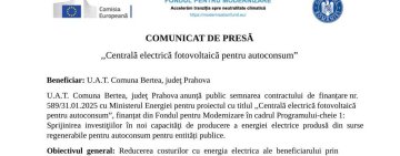 COMUNICAT DE PRESĂ - ,,Centrală electrică fotovoltaică pentru autoconsum” - U.A.T. Comuna Bertea, judeţ Prahova