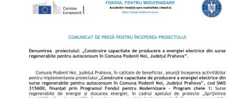 COMUNICAT DE PRESĂ PENTRU ÎNCEPEREA PROIECTULUI. „Construire capacitate de producere a energiei electrice din surse regenerabile pentru autoconsum în Comuna Podenii Noi, Județul Prahova”.