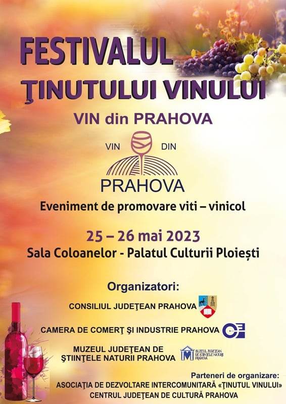 În perioada 25 – 26 mai 2023, se va desfășura la Sala Coloanelor – Palatul Culturii Ploiești, cea de-a doua editie a evenimentului de promovare viti-vinicol Festivalul Ținutului Vinului – VIN din PRAHOVA.