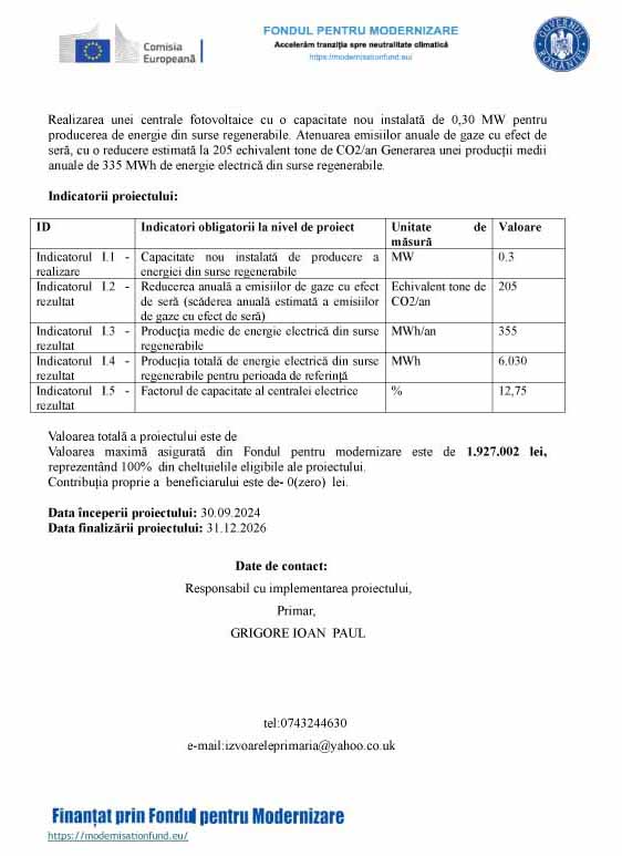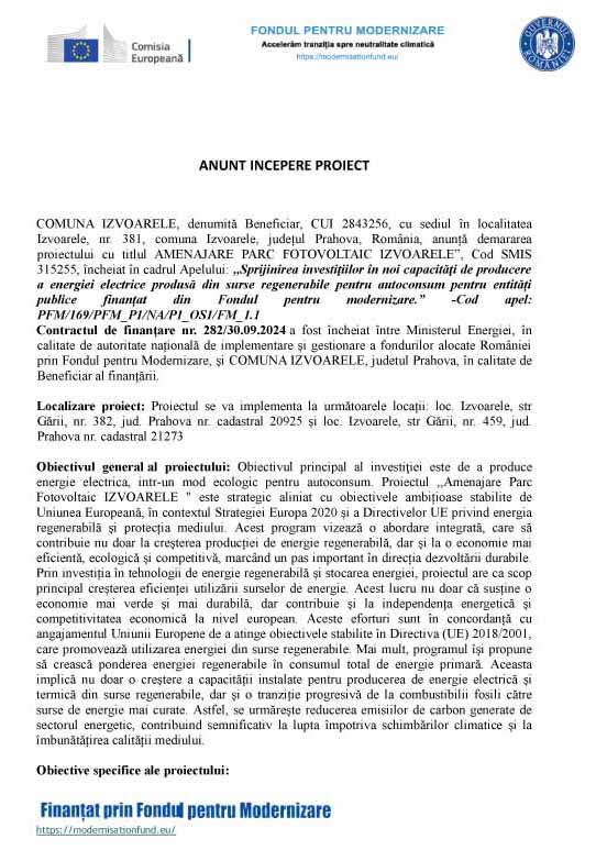 COMUNA IZVOARELE, denumită Beneficiar, CUI 2843256, cu sediul în localitatea Izvoarele, nr. 381, comuna Izvoarele, județul Prahova, România, anunță demararea proiectului cu titlul AMENAJARE PARC FOTOVOLTAIC IZVOARELE”, Cod SMIS 315255, încheiat în cadrul Apelului: ,,Sprijinirea investiţiilor în noi capacităţi de producere a energiei electrice produsă din surse regenerabile pentru autoconsum pentru entități publice finanțat din Fondul pentru modernizare.” -Cod apel: PFM/169/PFM_P1/NA/P1_OS1/FM_1.1