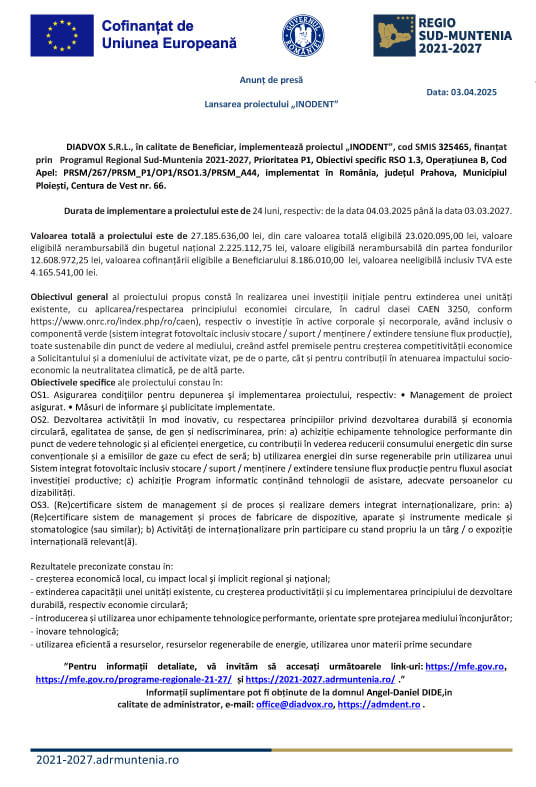 DIADVOX S.R.L., în calitate de Beneficiar, implementează proiectul „INODENT”, cod SMIS 325465, finanțat prin Programul Regional Sud-Muntenia 2021-2027, Prioritatea P1, Obiectivi specific RSO 1.3, Operațiunea B, Cod Apel: PRSM/267/PRSM_P1/OP1/RSO1.3/PRSM_A44, implementat în România, județul Prahova, Municipiul Ploiești, Centura de Vest nr. 66.