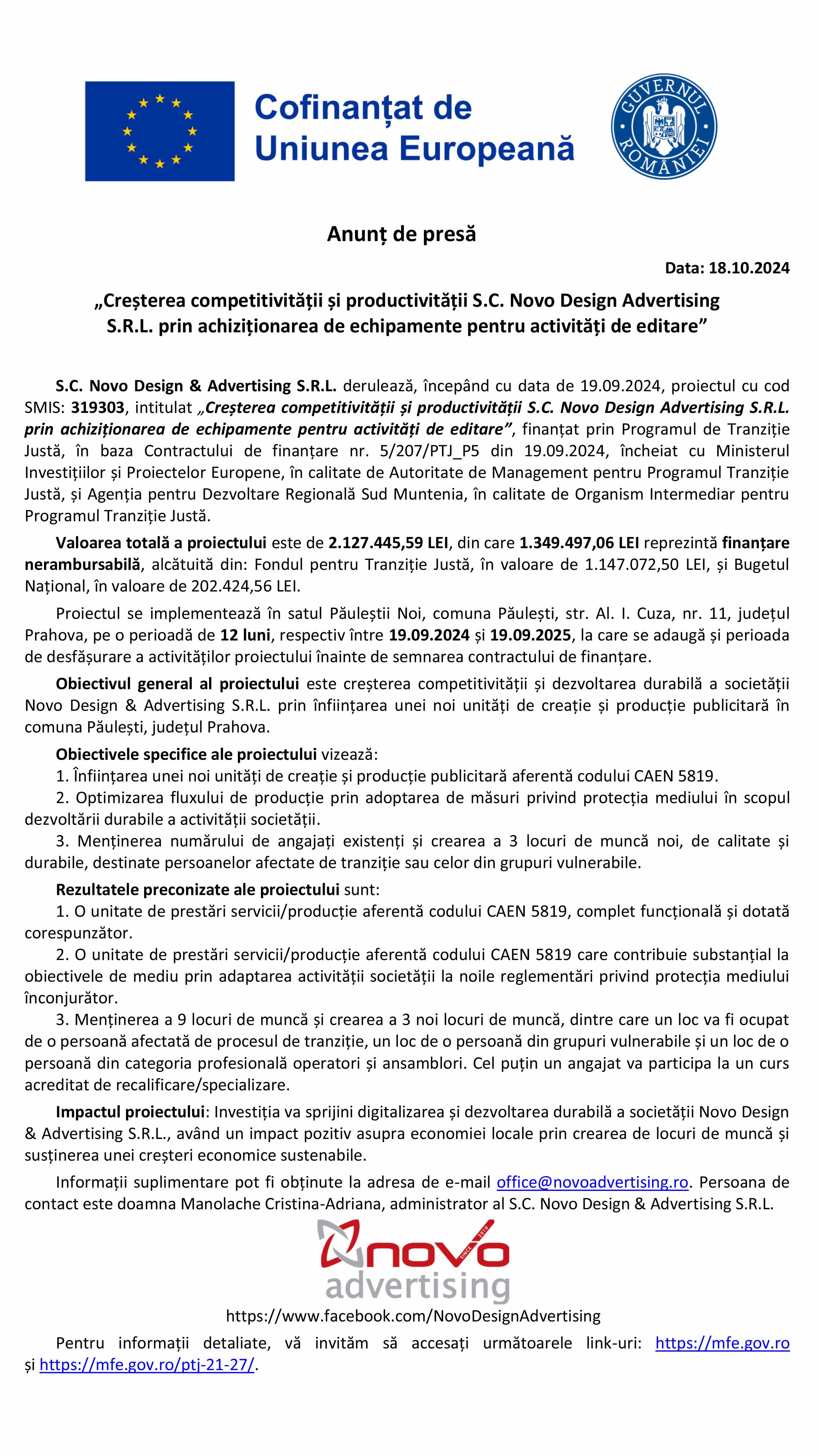 S.C. Novo Design & Advertising S.R.L. derulează, începând cu data de 19.09.2024, proiectul cu cod SMIS: 319303, intitulat „Creșterea competitivității și productivității S.C. Novo Design Advertising S.R.L. prin achiziționarea de echipamente pentru activități de editare”, finanțat prin Programul de Tranziție Justă, în baza Contractului de finanțare nr. 5/207/PTJ_P5 din 19.09.2024, încheiat cu Ministerul Investițiilor și Proiectelor Europene, în calitate de Autoritate de Management pentru Programul Tranziție Justă, și Agenția pentru Dezvoltare Regională Sud Muntenia, în calitate de Organism Intermediar pentru Programul Tranziție Justă.