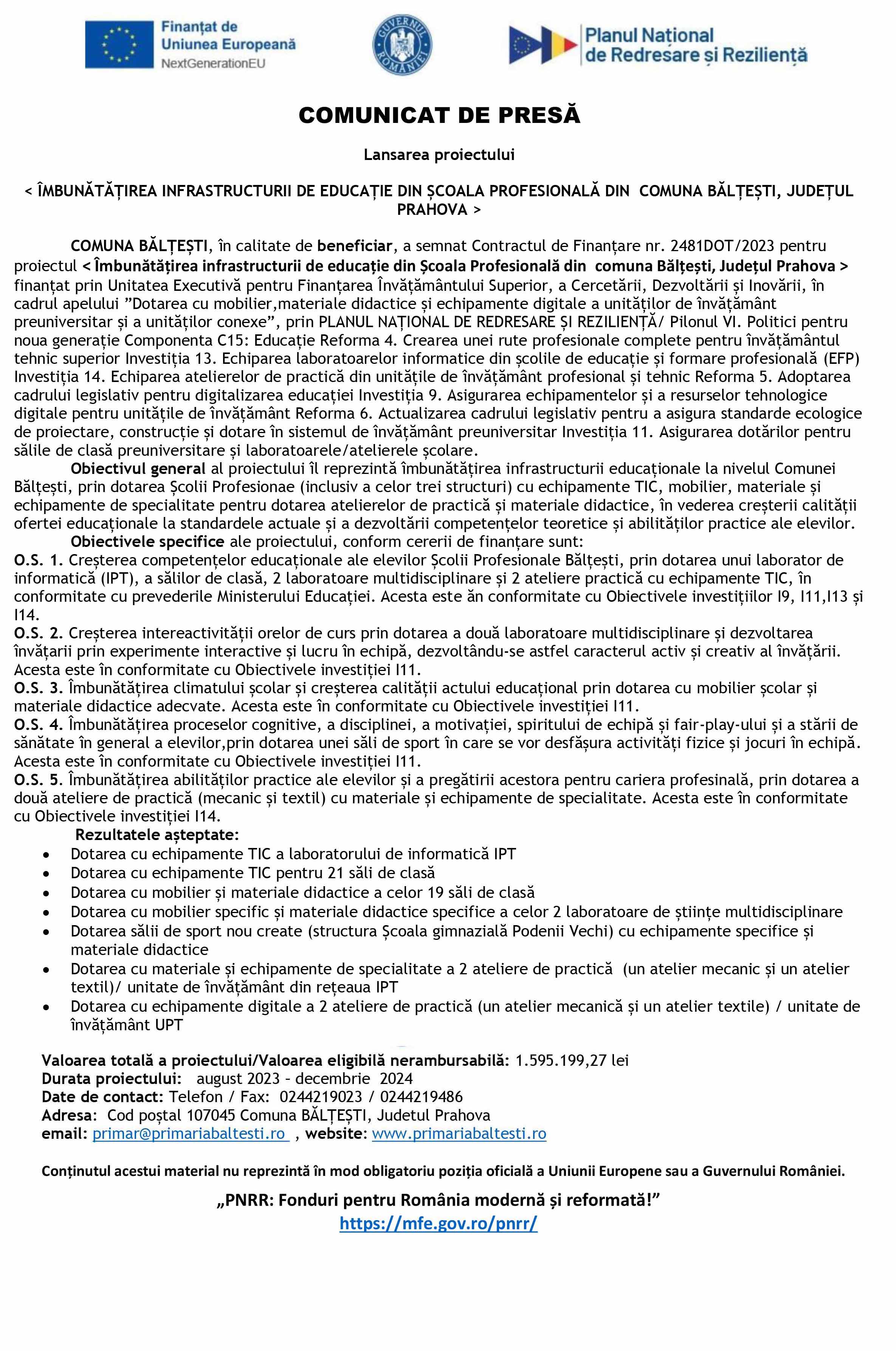 COMUNA BĂLȚEȘTI, în calitate de beneficiar, a semnat Contractul de Finanțare nr. 2481DOT/2023 pentru proiectul < Îmbunătățirea infrastructurii de educație din Școala Profesională din comuna Bălțești, Județul Prahova > finanțat prin Unitatea Executivă pentru Finanțarea Învățământului Superior, a Cercetării, Dezvoltării și Inovării, în cadrul apelului ”Dotarea cu mobilier,materiale didactice și echipamente digitale a unităților de învățământ preuniversitar și a unităților conexe”, prin PLANUL NAȚIONAL DE REDRESARE ȘI REZILIENȚĂ/ Pilonul VI. Politici pentru noua generație Componenta C15: Educație Reforma 4. Crearea unei rute profesionale complete pentru învățământul tehnic superior Investiția 13. Echiparea laboratoarelor informatice din școlile de educație și formare profesională (EFP) Investiția 14. Echiparea atelierelor de practică din unitățile de învățământ profesional și tehnic Reforma 5. Adoptarea cadrului legislativ pentru digitalizarea educației Investiția 9. Asigurarea echipamentelor și a resurselor tehnologice digitale pentru unitățile de învățământ Reforma 6. Actualizarea cadrului legislativ pentru a asigura standarde ecologice de proiectare, construcție și dotare în sistemul de învățământ preuniversitar Investiția 11. Asigurarea dotărilor pentru sălile de clasă preuniversitare și laboratoarele/atelierele școlare.