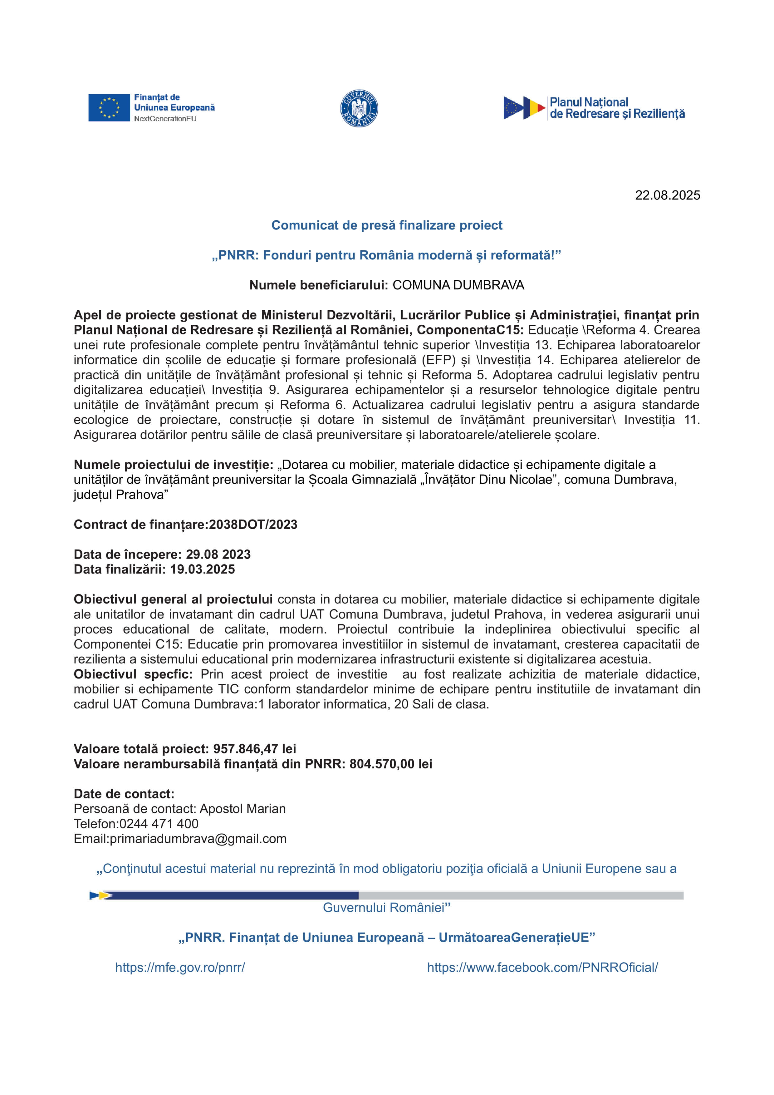 COMUNA DUMBRAVA - Comunicat de presă finalizare proiect - „PNRR: Fonduri pentru România modernă și reformată!”