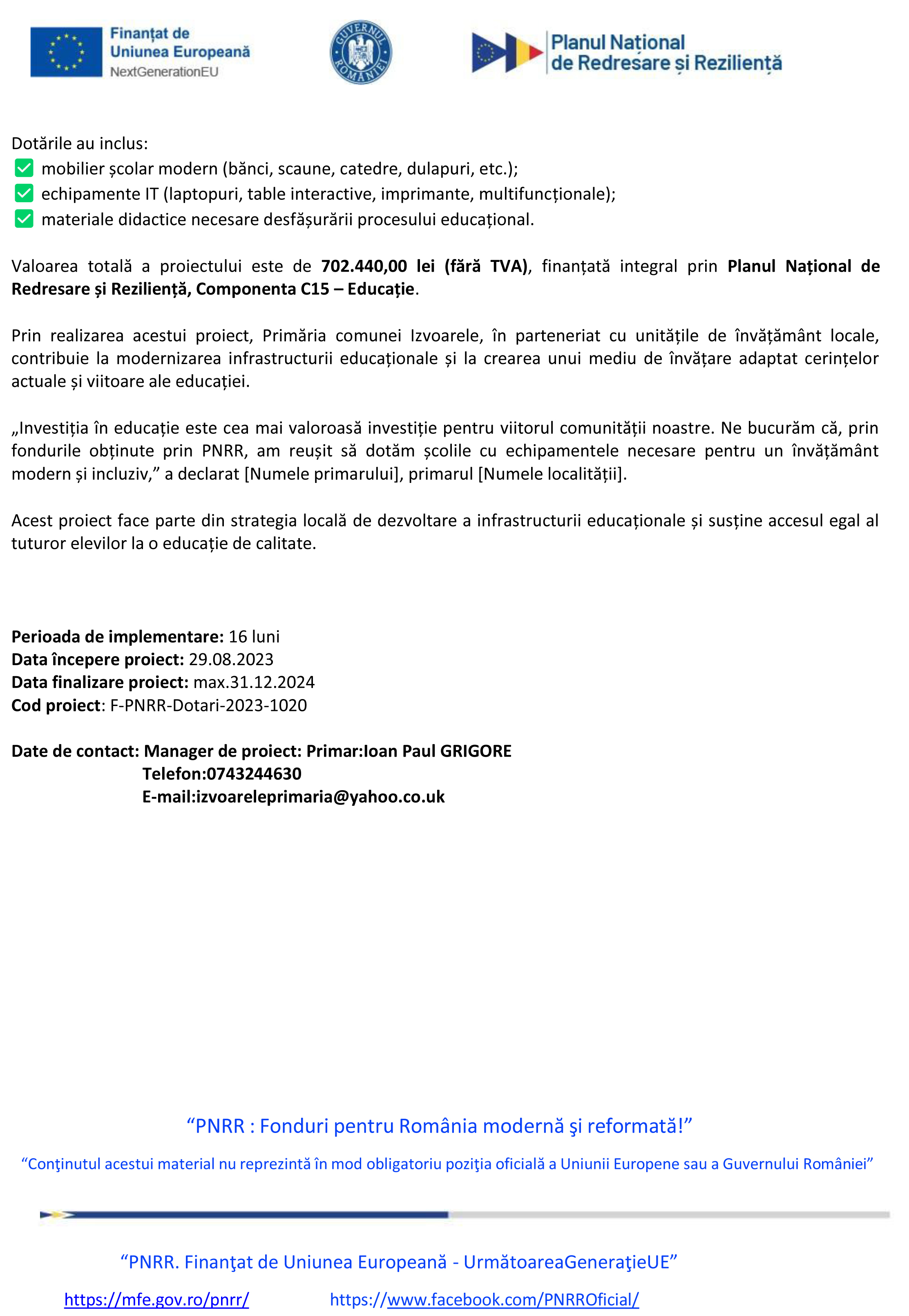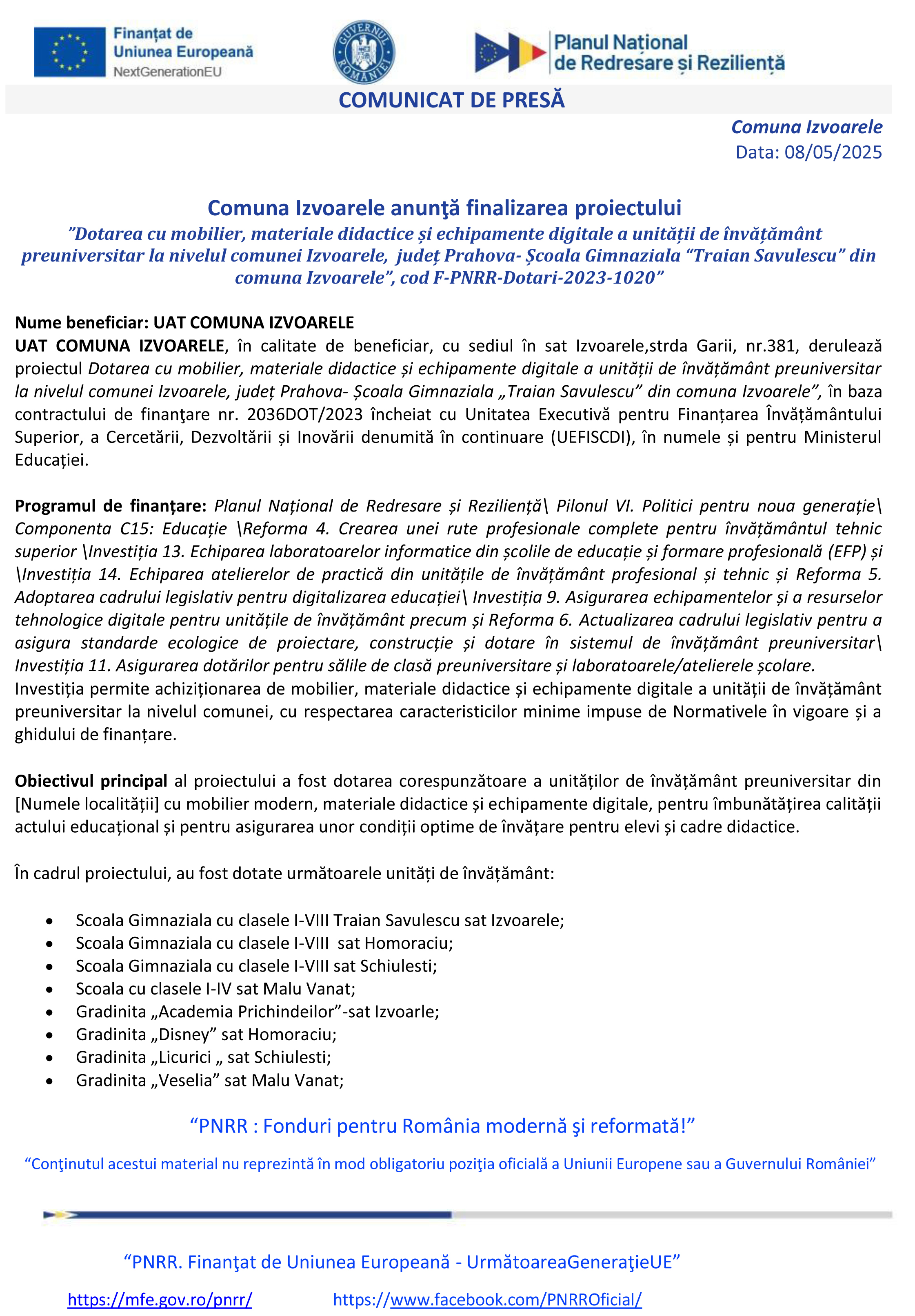 COMUNICAT DE PRESĂ - COMUNA IZVOARELE