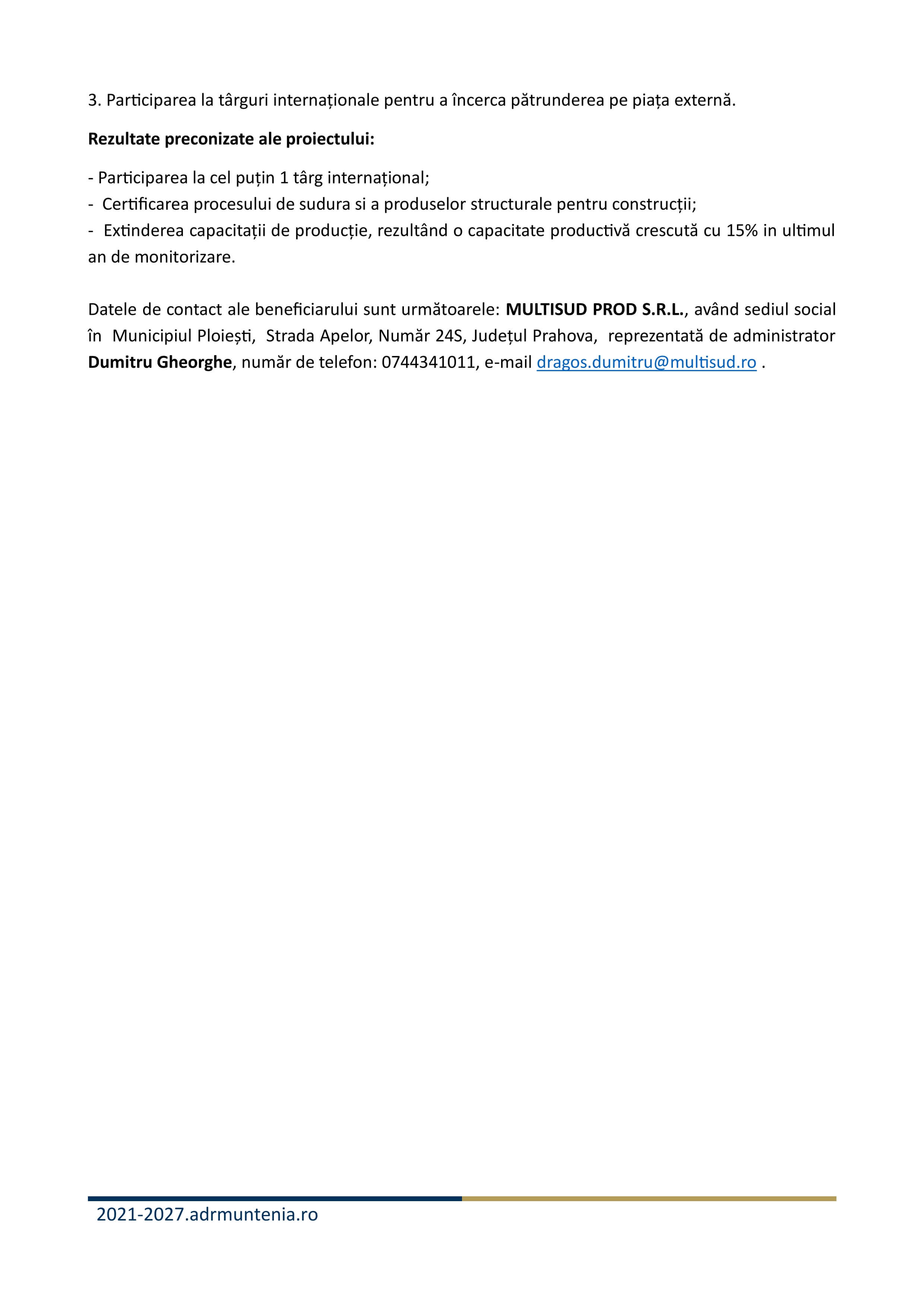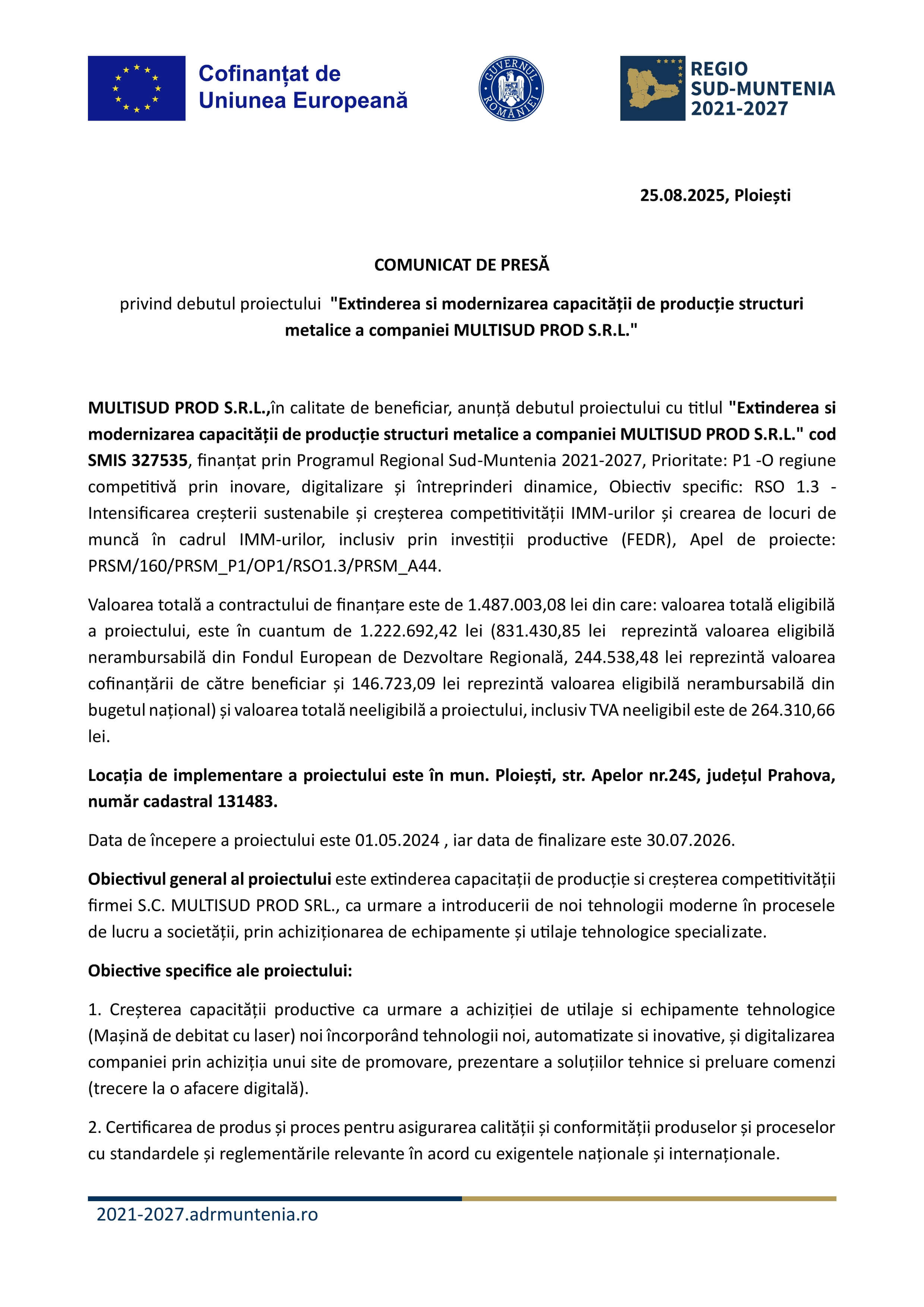 COMUNICAT DE PRESĂ privind debutul proiectului "Extinderea si modernizarea capacității de producție structuri metalice a companiei MULTISUD PROD S.R.L."
