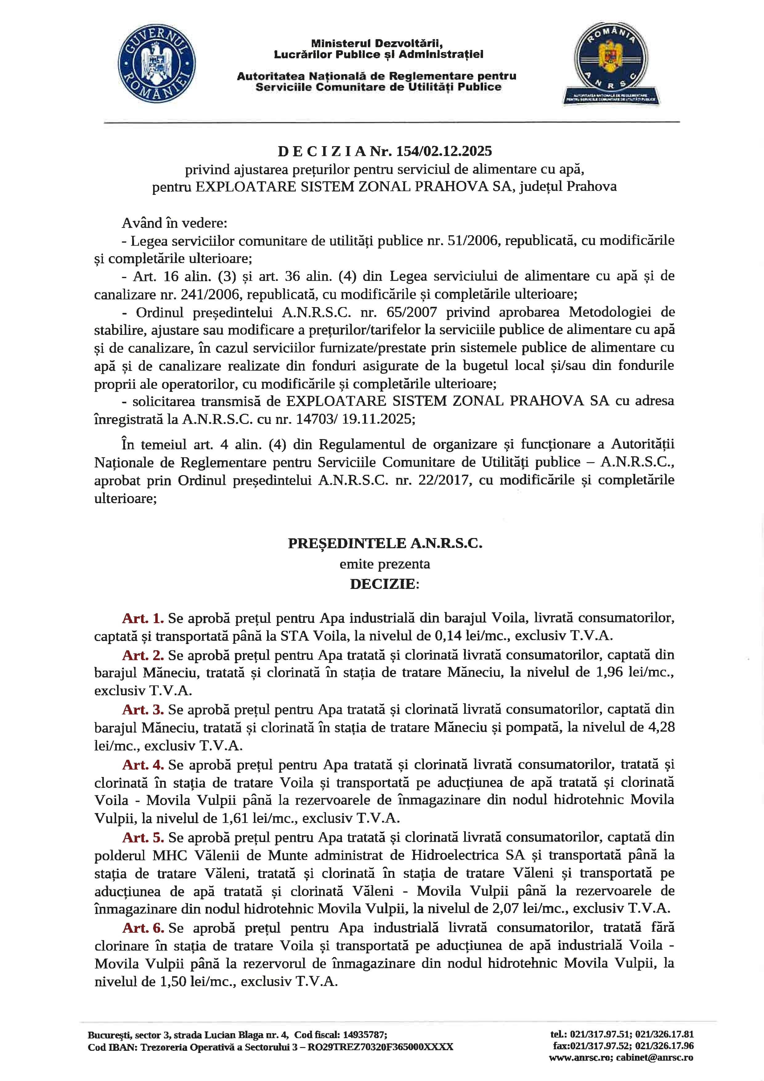Prin Decizia ANRSC nr.154/02.12.2025, au fost aprobate tarifele de autoritatea națională competentă cu aplicare incepand cu data de 01.01.2026.