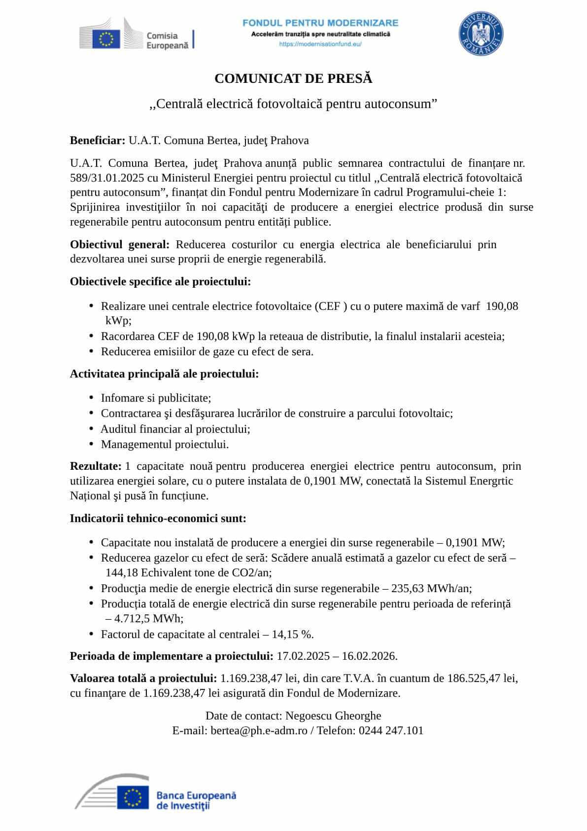U.A.T. Comuna Bertea, judeţ Prahova anunță public semnarea contractului de finanțare nr. 589/31.01.2025 cu Ministerul Energiei pentru proiectul cu titlul ,,Centrală electrică fotovoltaică pentru autoconsum”, finanțat din Fondul pentru Modernizare în cadrul Programului-cheie 1: Sprijinirea investiţiilor în noi capacităţi de producere a energiei electrice produsă din surse regenerabile pentru autoconsum pentru entități publice.