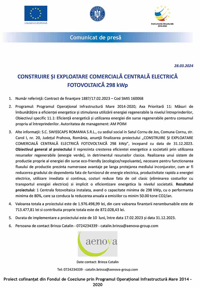 - Alte informaţii: S.C. SWISSCAPS ROMANIA S.R.L., cu sediul social in Satul Cornu de Jos, Comuna Cornu, str. Carol I, nr. 20, Județul Prahova, România, anunţă finalizarea proiectului „CONSTRUIRE ȘI EXPLOATARE COMERCIALĂ CENTRALĂ ELECTRICĂ FOTOVOLTAICĂ 298 kWp”, incepand cu data de 31.12.2023. Obiectivul general al proiectului il reprezinta cresterea eficientei energetice a societatii prin utilizarea resurselor regenerabile (energie verde), in detrimentul resurselor clasice. Realizarea unui sistem de productie proprie al energiei din surse eco-friendly (ecologice/nepoluante), necesare pentru functionarea fluxului de productie prezinta numeroase avantaje pe langa protejarea mediului inconjurator, cum ar fi reducerea gradului de dependenta fata de furnizorul de energie electrica, productivitate rapida a energiei electrice, utilizare imediata si continua, costuri reduse fata de cel clasic (eliminarea costurilor cu transportul energiei electrice) si implicit o eficientizare energetica la nivelul societatii. Rezultatul proiectului: 1 Centrala fotovoltaica instalata, avand o capacitate minima de 298 kWp, cu o performanta minima de 80%, care sa conduca la reducerea anuala a emisiilor cu minim 50.00 tone CO2/an.
