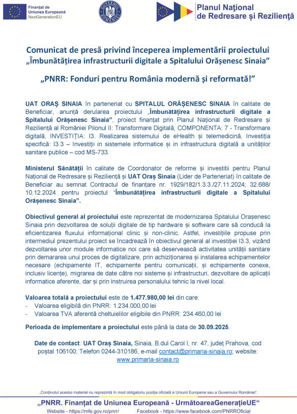 UAT ORAȘ SINAIA în parteneriat cu SPITALUL ORĂȘENESC SINAIA în calitate de Beneficiar, anunță derularea proiectului „Îmbunătățirea infrastructurii digitale a Spitalului Orășenesc Sinaia”, proiect finanțat prin Planul Național de Redresare și Reziliență al României Pilonul II: Transformare Digitală, COMPONENTA: 7 - Transformare digitală, INVESTIȚIA: I3. Realizarea sistemului de eHealth și telemedicină, Investiția specifică: I3.3 – Investiții in sistemele informatice și in infrastructura digitală a unităților sanitare publice – cod MS-733.