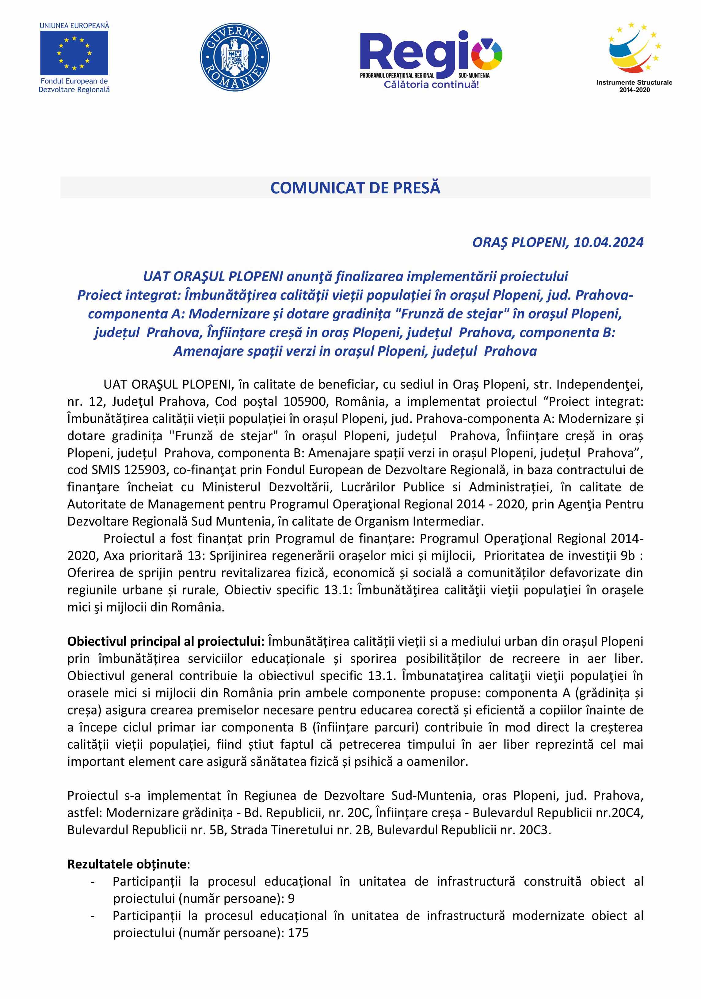 COMUNICAT DE PRESĂ | UAT ORAŞUL PLOPENI