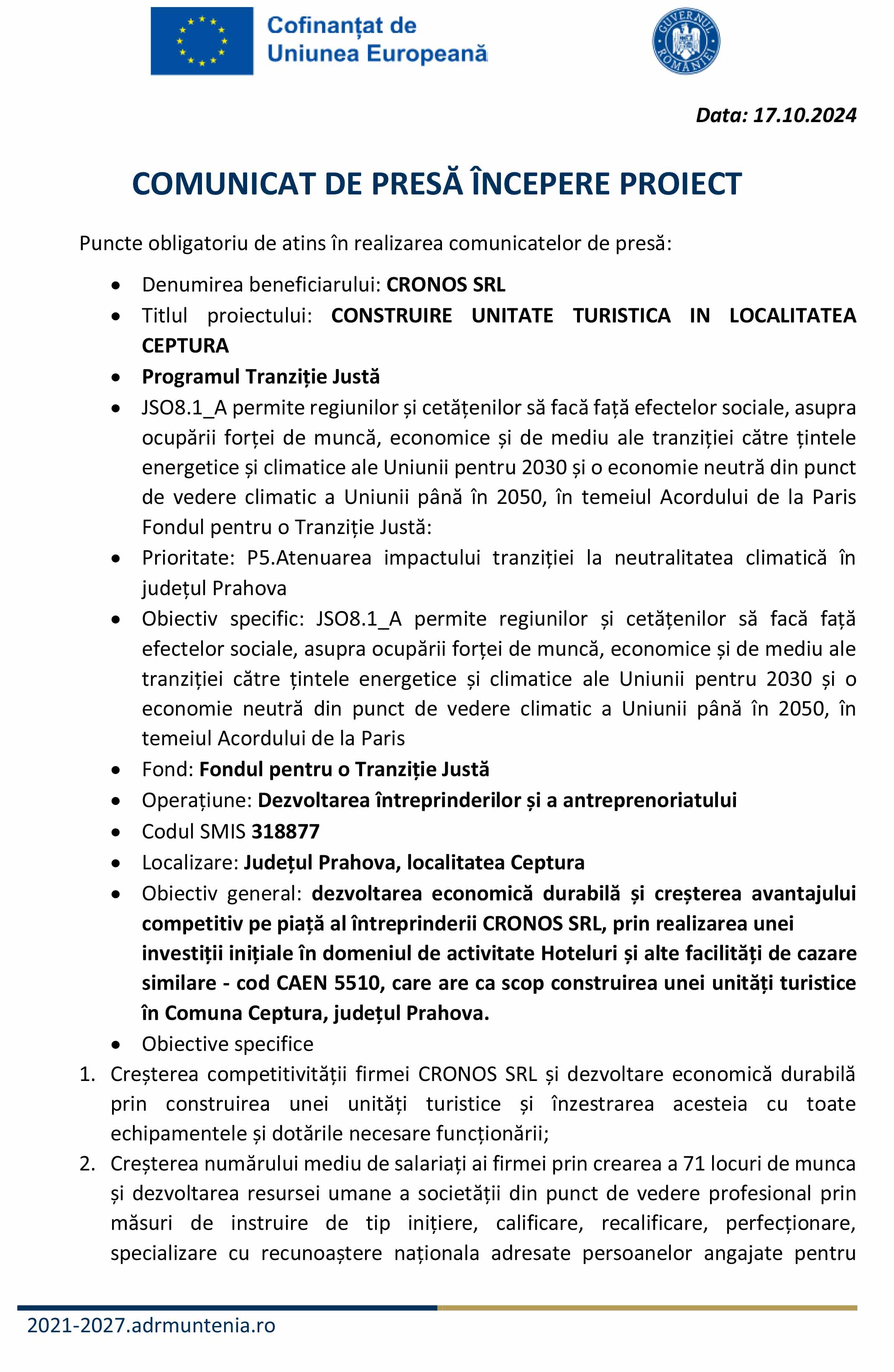 investiții inițiale în domeniul de activitate Hoteluri și alte facilități de cazare similare - cod CAEN 5510, care are ca scop construirea unei unități turistice în Comuna Ceptura, județul Prahova.