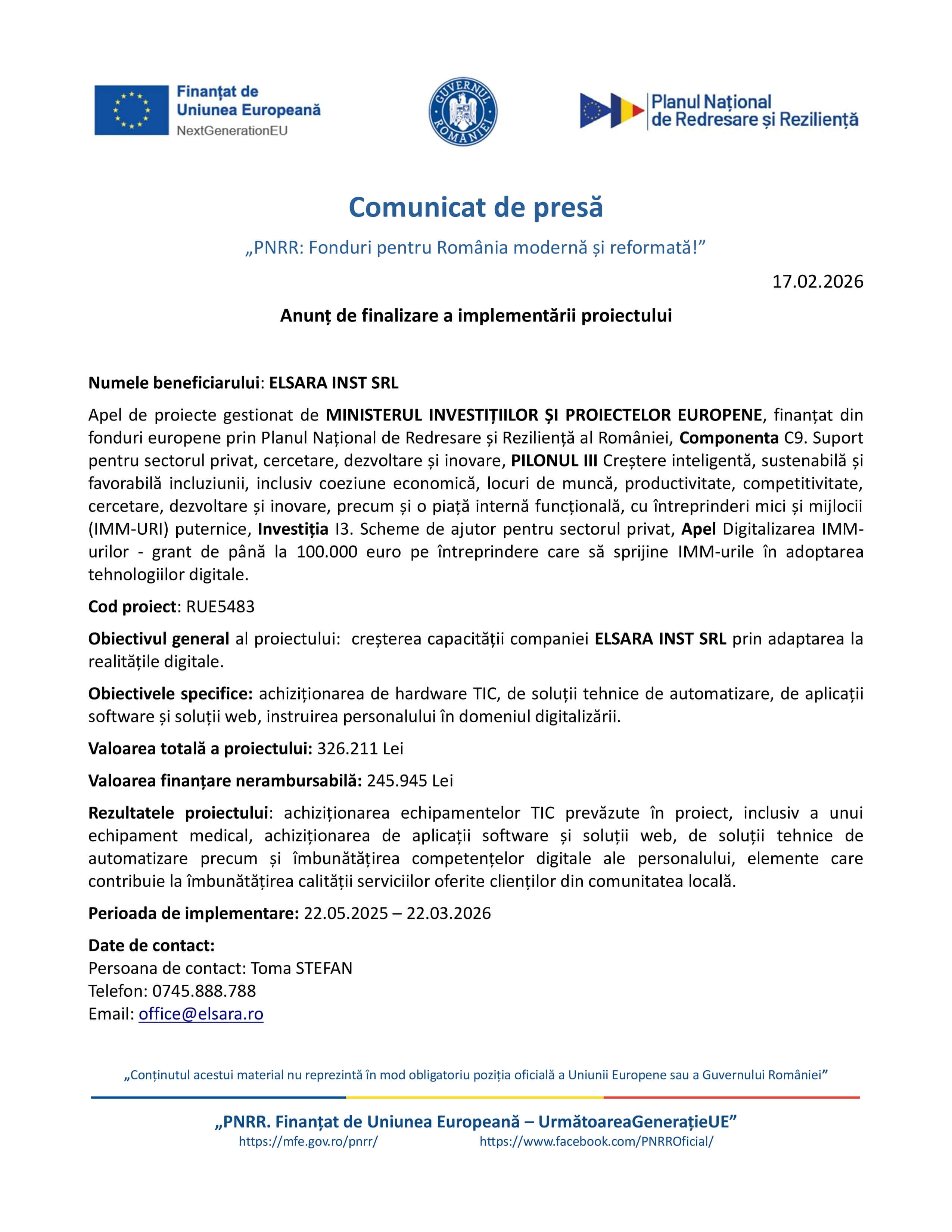 ELSARA INST SRL - Comunicat de presă - Anunț de finalizare a implementării proiectului