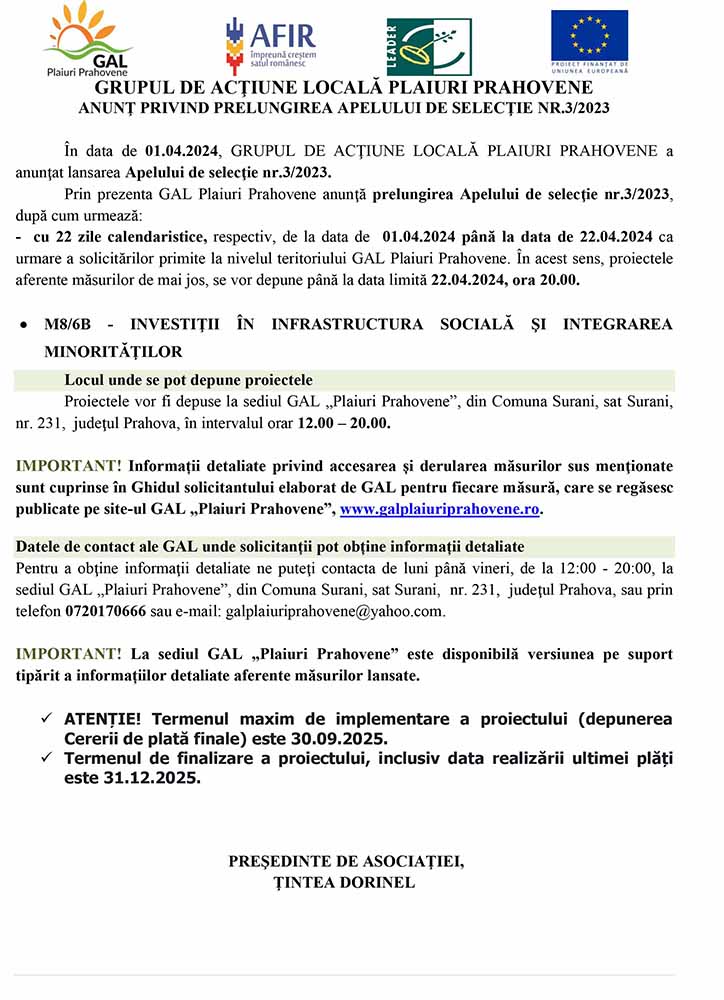 Prin prezenta GAL Plaiuri Prahovene anunţă prelungirea Apelului de selecţie nr.3/2023, după cum urmează: