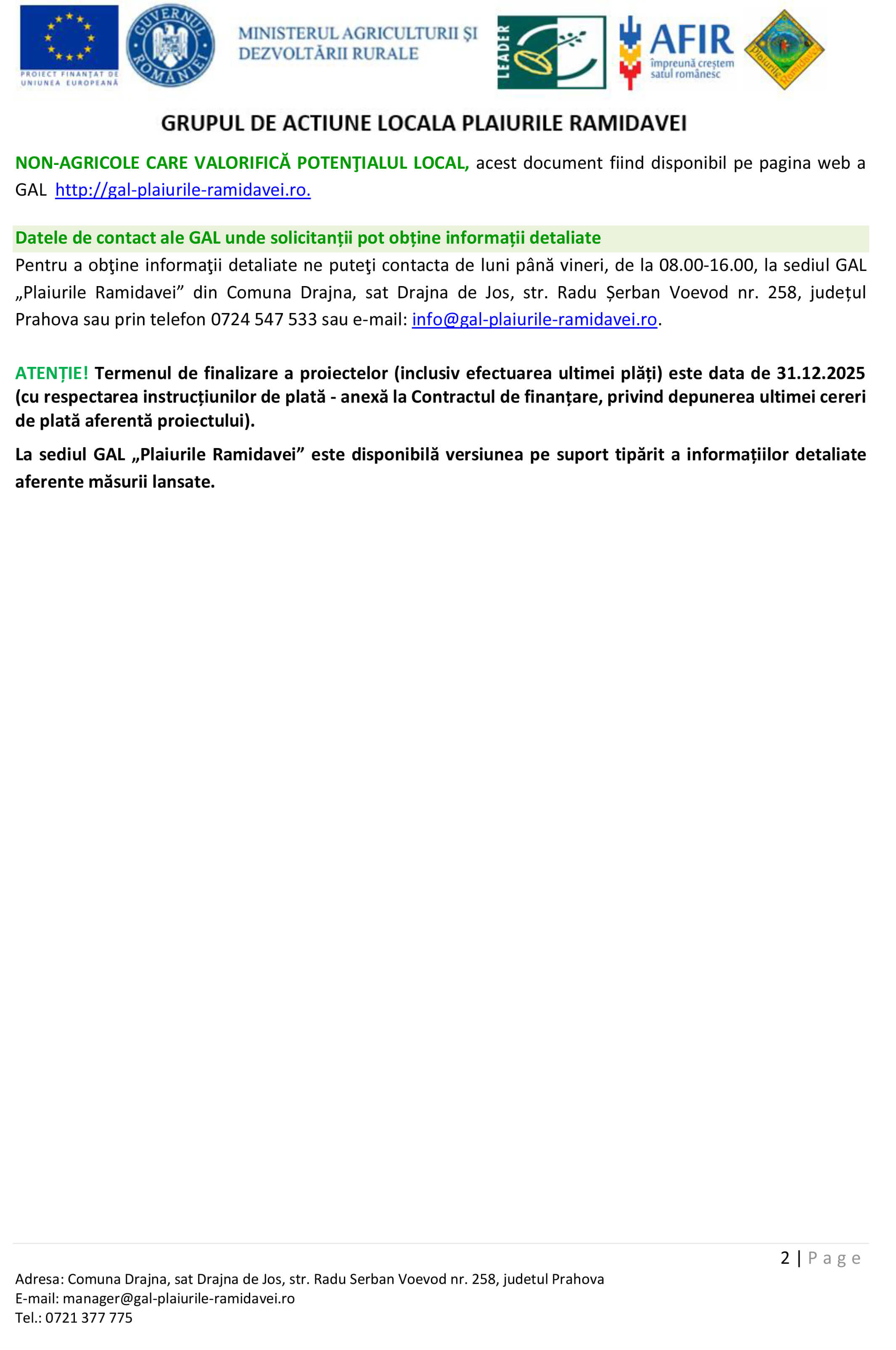 Pentru a obţine informaţii detaliate ne puteţi contacta de luni până vineri, de la 08.00-16.00, la sediul GAL „Plaiurile Ramidavei” din Comuna Drajna, sat Drajna de Jos, str. Radu Șerban Voevod nr. 258, județul Prahova sau prin telefon 0724 547 533 sau e-mail: