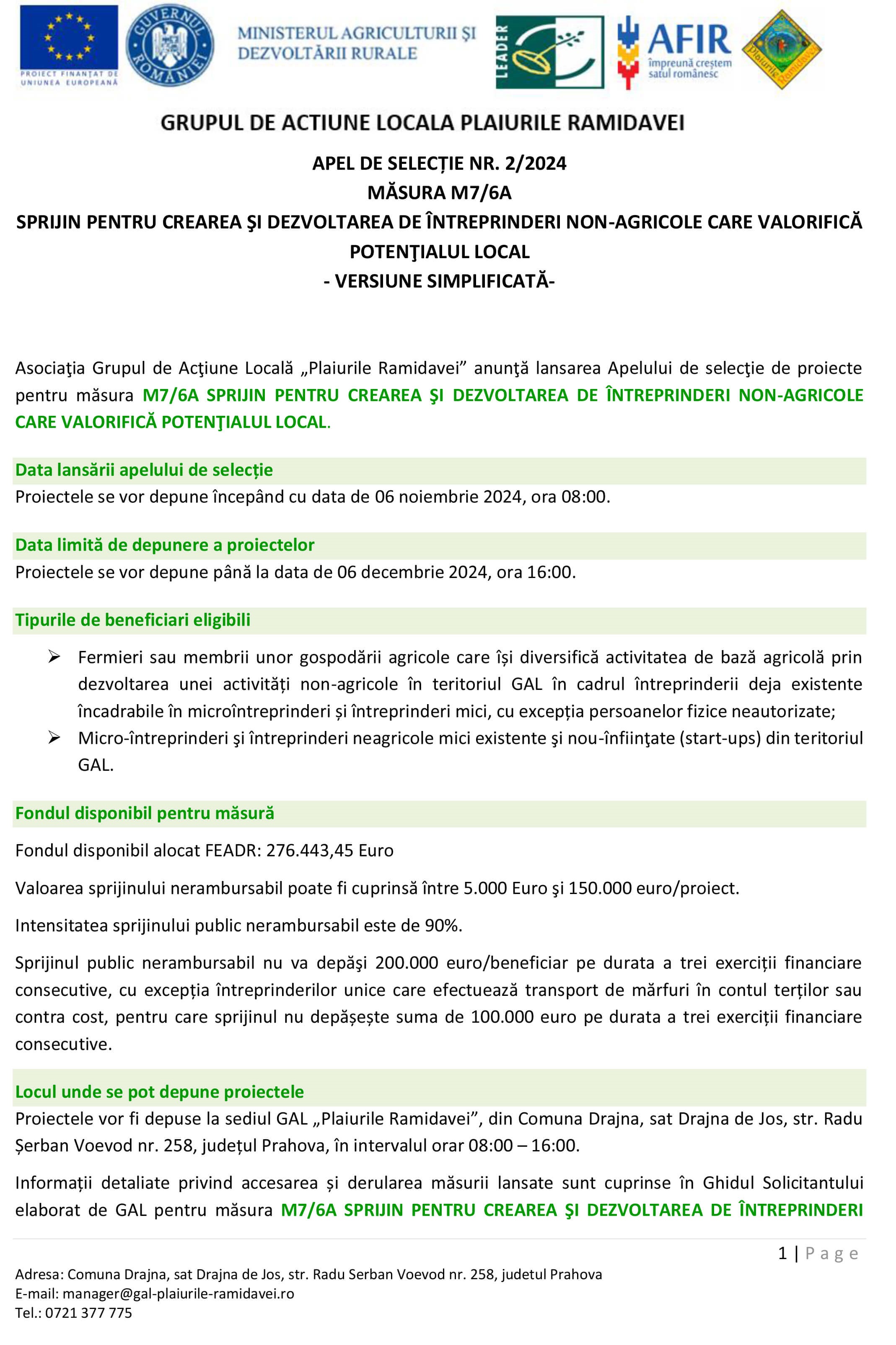 Informații detaliate privind accesarea și derularea măsurii lansate sunt cuprinse în Ghidul Solicitantului elaborat de GAL pentru măsura M7/6A SPRIJIN PENTRU CREAREA ŞI DEZVOLTAREA DE ÎNTREPRINDERI NON-AGRICOLE CARE VALORIFICĂ POTENŢIALUL LOCAL, acest document fiind disponibil pe pagina web a GAL http://gal-plaiurile-ramidavei.ro.