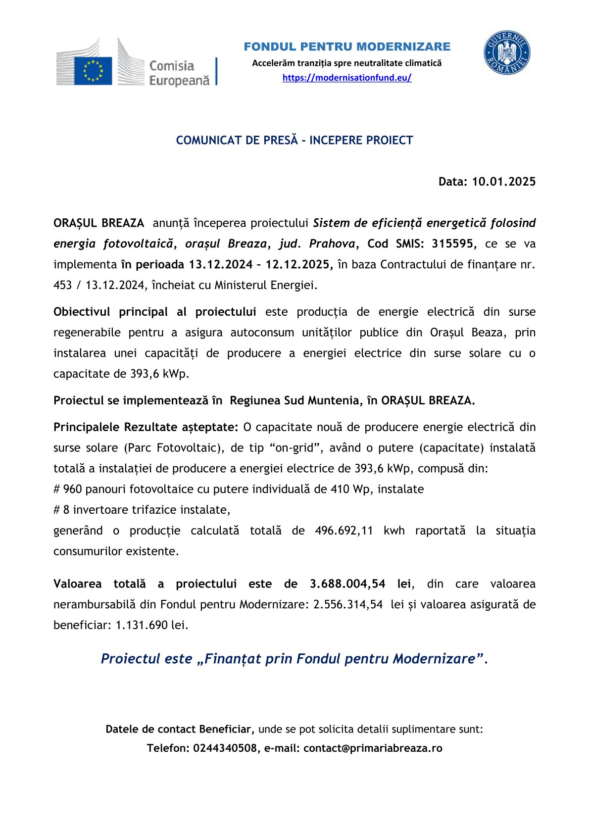 ORAȘUL BREAZA anunță începerea proiectului Sistem de eficiență energetică folosind energia fotovoltaică, orașul Breaza, jud. Prahova, Cod SMIS: 315595, ce se va implementa în perioada 13.12.2024 – 12.12.2025, în baza Contractului de finanțare nr. 453 / 13.12.2024, încheiat cu Ministerul Energiei.