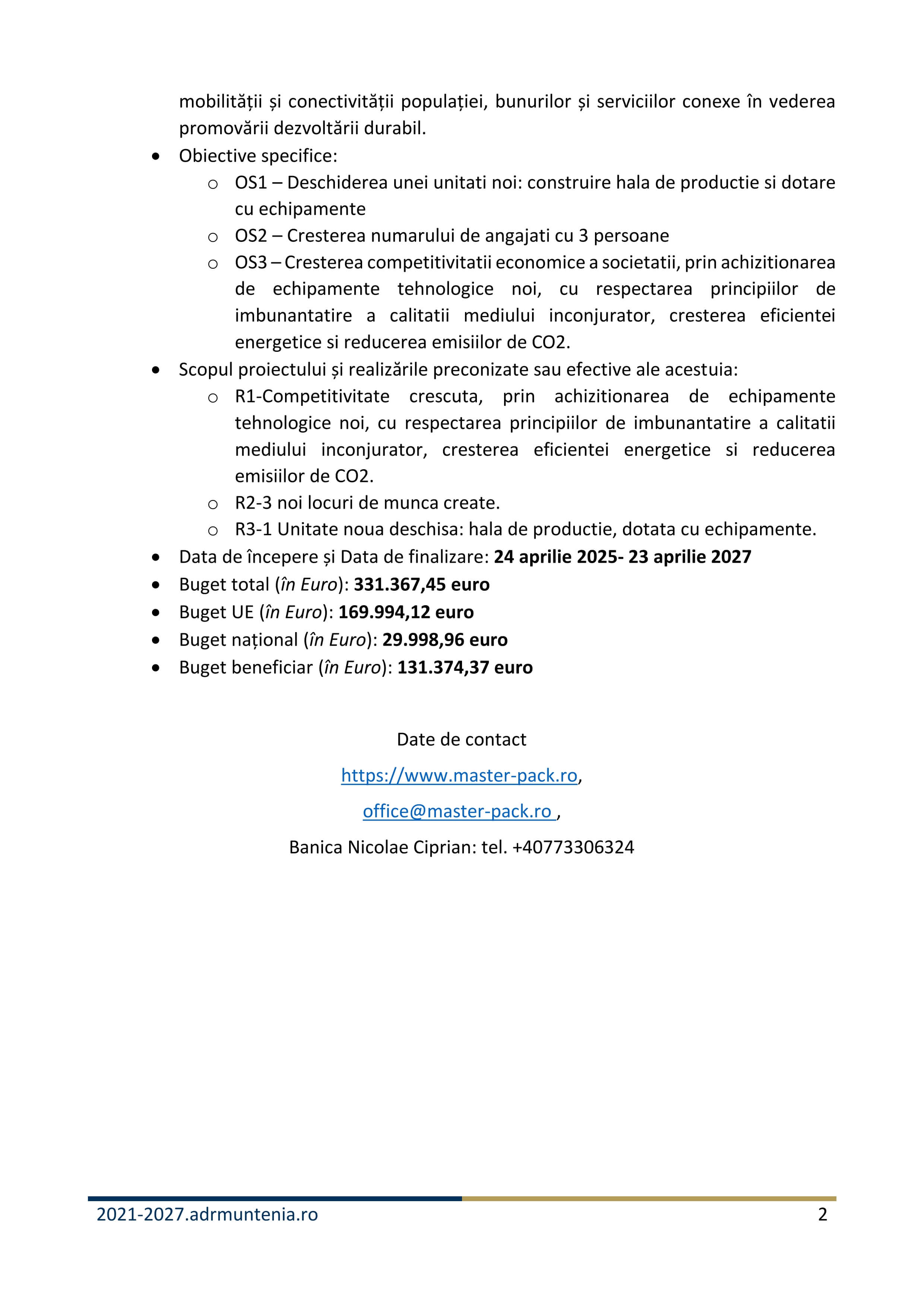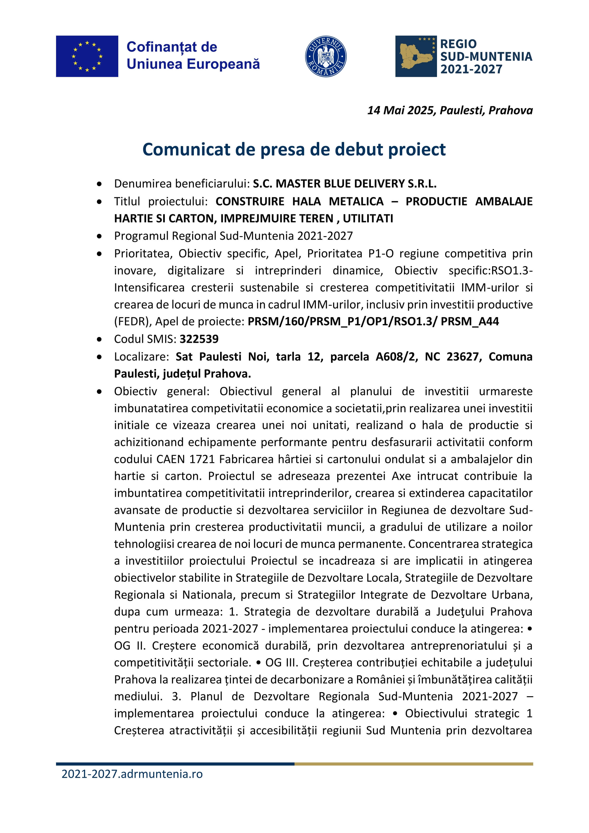 S.C. MASTER BLUE DELIVERY S.R.L. - Comunicat de presa de debut proiect