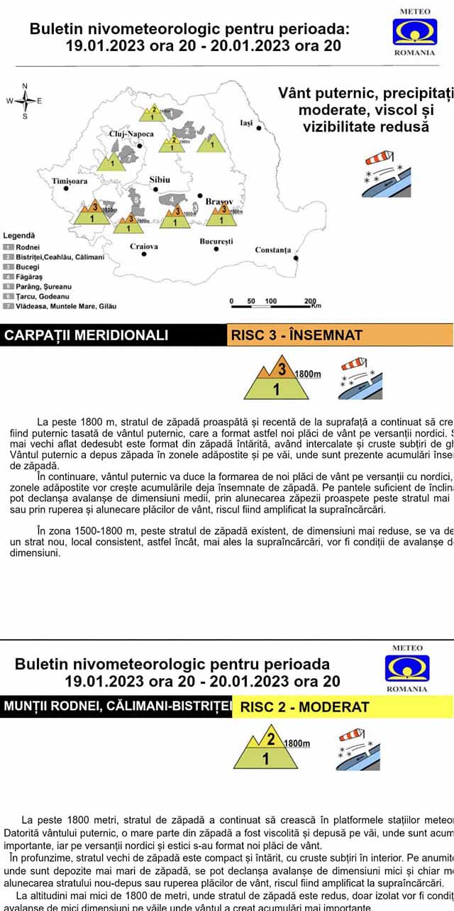 La altitudini de peste 1800 m există un risc însemnat de avalanșă. Vântul a depus cantități importante de zăpadă pe văi, iar pe pantele nordice a creat plăci, care se pot desprinde la supraîncărcare. În perioada următoare, conform prognozei, se anunță depunerea unui nou strat de zăpadă la peste 1800 m, ceea ce va crește riscul producerii unor avalanșe. În acest moment avem 100 cm zăpadă la Vf. Omu, dar acumulările cauzate de vânt sunt și de 3-4 m.