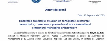Anunț de presă | Finalizarea proiectului LUCRĂRI DE CONSOLIDARE, RESTAURARE, RECONSTITUIRE, CONSERVARE ȘI PUNERE ÎN VALOARE A ANSAMBLULUI ARHITECTURAL MĂNĂSTIREA BRÂNCOVENI