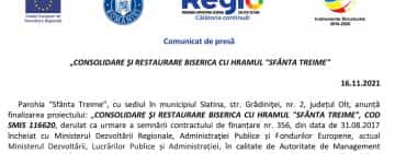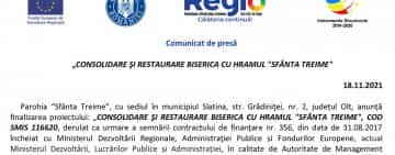 Comunicat de presă: „CONSOLIDARE ŞI RESTAURARE BISERICA CU HRAMUL "SFÂNTA TREIME"