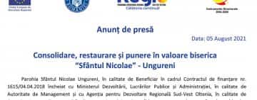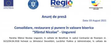 Anunț de presă: Consolidare, restaurare și punere în valoare biserica “Sfântul Nicolae” - Ungureni