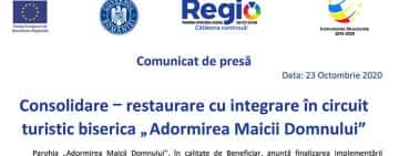 Comunicat de presă: Consolidare – restaurare cu integrare în circuit turistic biserica„Adormirea Maicii Domnului”