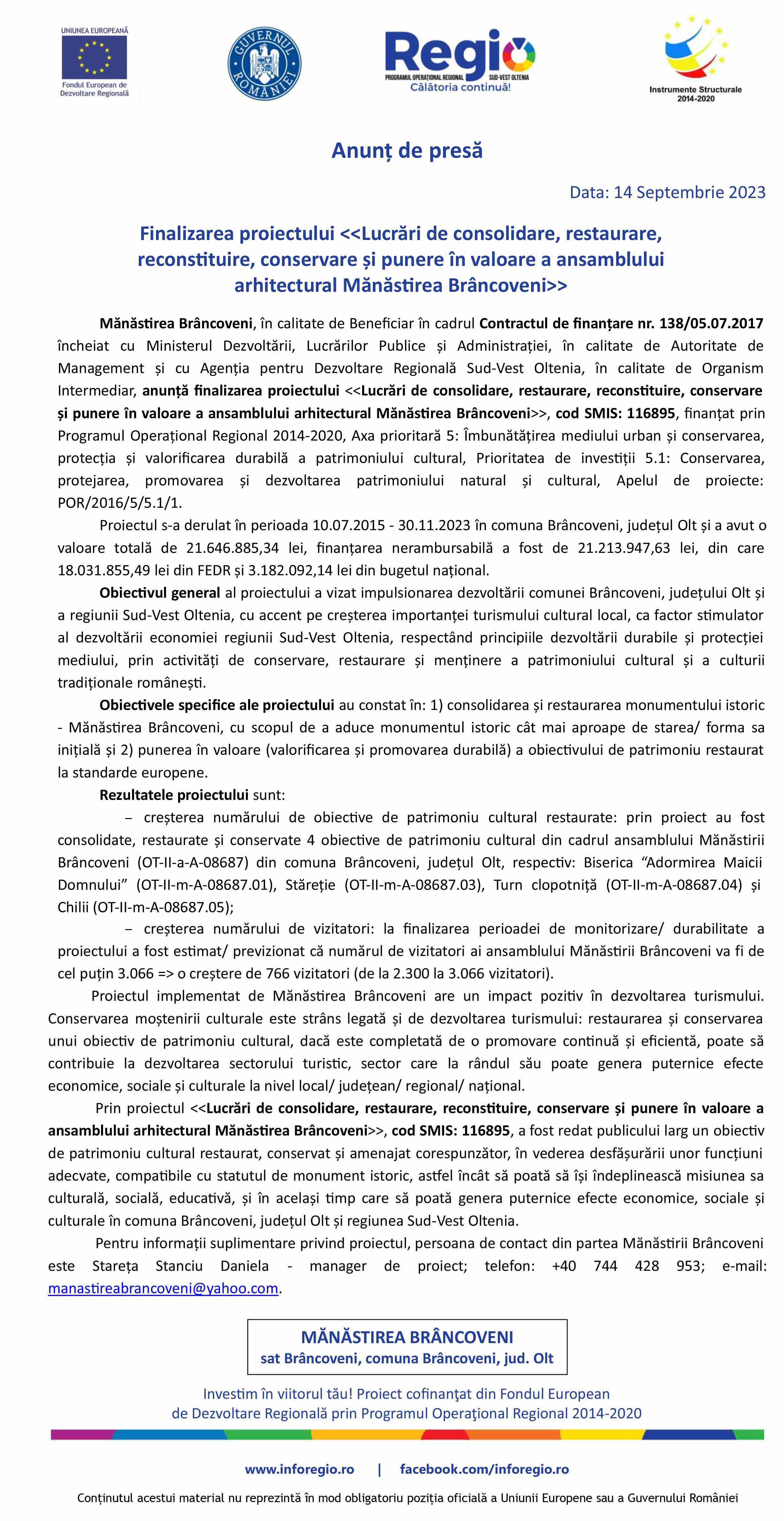 Mănăstirea Brâncoveni, în calitate de Beneficiar în cadrul Contractul de finanțare nr. 138/05.07.2017 încheiat cu Ministerul Dezvoltării, Lucrărilor Publice și Administrației, în calitate de Autoritate de Management și cu Agenția pentru Dezvoltare Regională Sud-Vest Oltenia, în calitate de Organism Intermediar, anunță finalizarea proiectului <<Lucrări de consolidare, restaurare, reconstituire, conservare și punere în valoare a ansamblului arhitectural Mănăstirea Brâncoveni>>, cod SMIS: 116895, finanțat prin Programul Operațional Regional 2014-2020, Axa prioritară 5: Îmbunătățirea mediului urban și conservarea, protecția și valorificarea durabilă a patrimoniului cultural, Prioritatea de investiții 5.1: Conservarea, protejarea, promovarea și dezvoltarea patrimoniului natural și cultural, Apelul de proiecte: POR/2016/5/5.1/1.