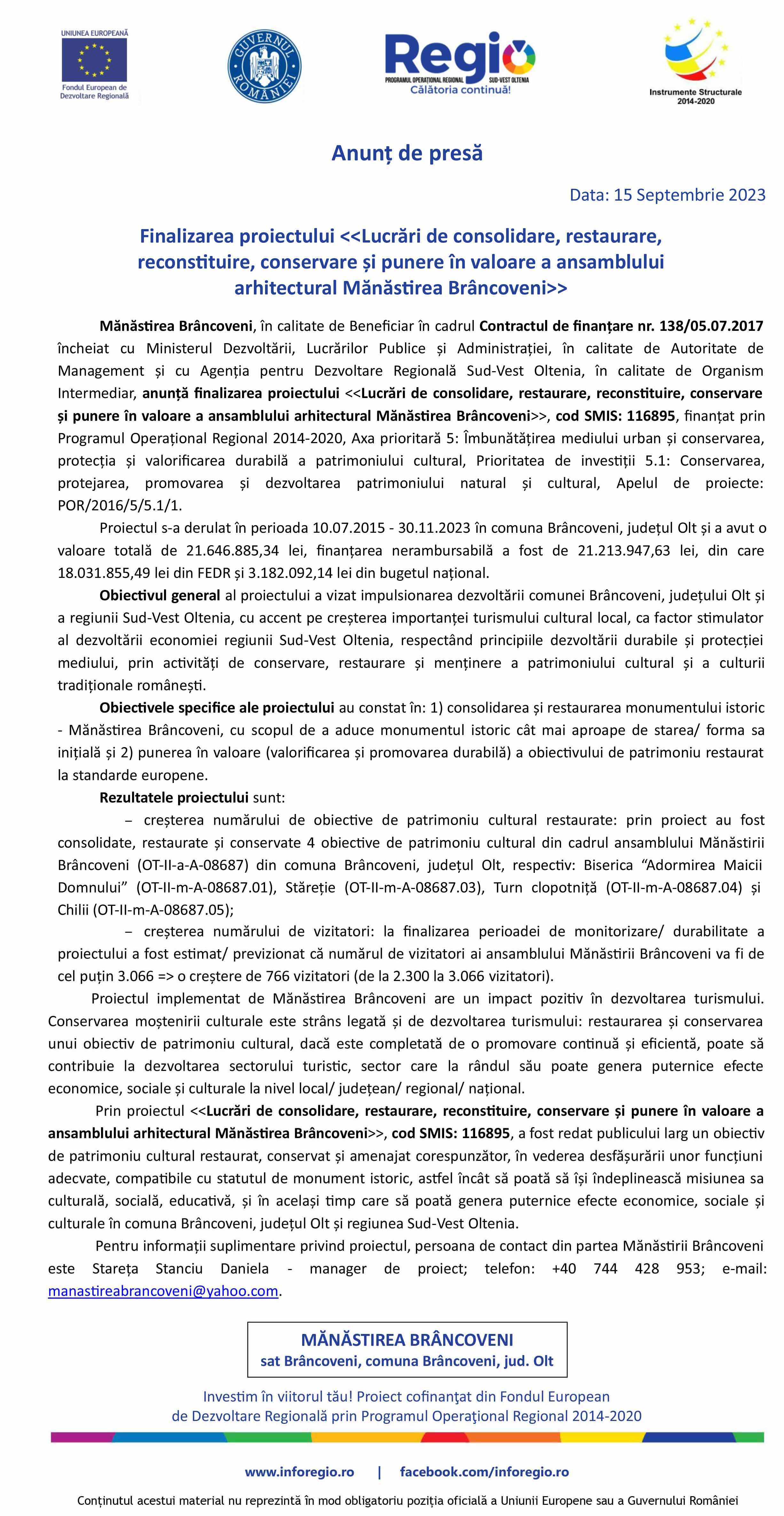 Mănăstirea Brâncoveni, în calitate de Beneficiar în cadrul Contractul de finanțare nr. 138/05.07.2017 încheiat cu Ministerul Dezvoltării, Lucrărilor Publice și Administrației, în calitate de Autoritate de Management și cu Agenția pentru Dezvoltare Regională Sud-Vest Oltenia, în calitate de Organism Intermediar, anunță finalizarea proiectului <<Lucrări de consolidare, restaurare, reconstituire, conservare și punere în valoare a ansamblului arhitectural Mănăstirea Brâncoveni>>, cod SMIS: 116895, finanțat prin Programul Operațional Regional 2014-2020, Axa prioritară 5: Îmbunătățirea mediului urban și conservarea, protecția și valorificarea durabilă a patrimoniului cultural, Prioritatea de investiții 5.1: Conservarea, protejarea, promovarea și dezvoltarea patrimoniului natural și cultural, Apelul de proiecte: POR/2016/5/5.1/1.