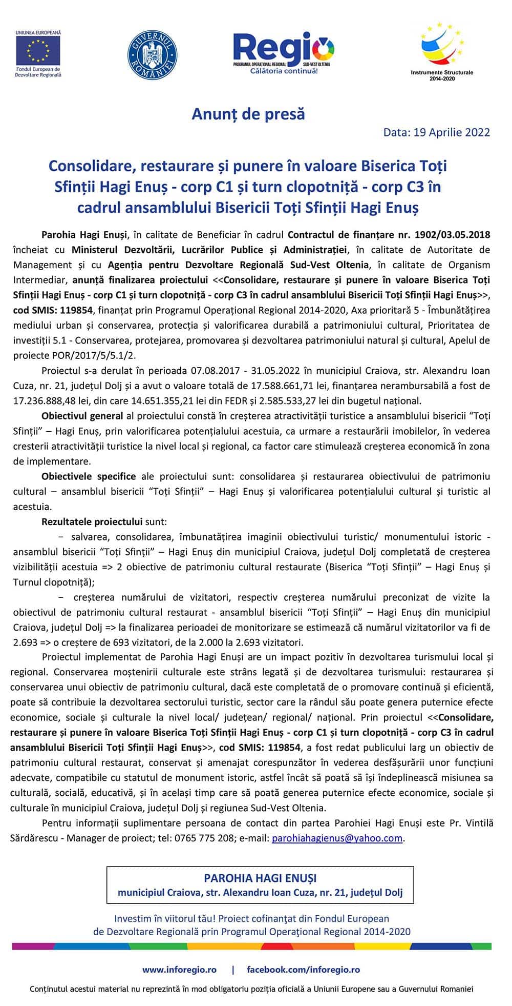 Parohia Hagi Enuși, în calitate de Beneficiar în cadrul Contractul de finanțare nr. 1902/03.05.2018 încheiat cu Ministerul Dezvoltării, Lucrărilor Publice și Administrației, în calitate de Autoritate de Management și cu Agenția pentru Dezvoltare Regională Sud-Vest Oltenia, în calitate de Organism Intermediar, anunță finalizarea proiectului <<Consolidare, restaurare și punere în valoare Biserica Toți Sfinții Hagi Enuș - corp C1 și turn clopotniță - corp C3 în cadrul ansamblului Bisericii Toți Sfinții Hagi Enuș>>, cod SMIS: 119854, finanțat prin Programul Operațional Regional 2014-2020, Axa prioritară 5 - Îmbunătățirea mediului urban și conservarea, protecția și valorificarea durabilă a patrimoniului cultural, Prioritatea de investiții 5.1 - Conservarea, protejarea, promovarea și dezvoltarea patrimoniului natural și cultural, Apelul de proiecte POR/2017/5/5.1/2.