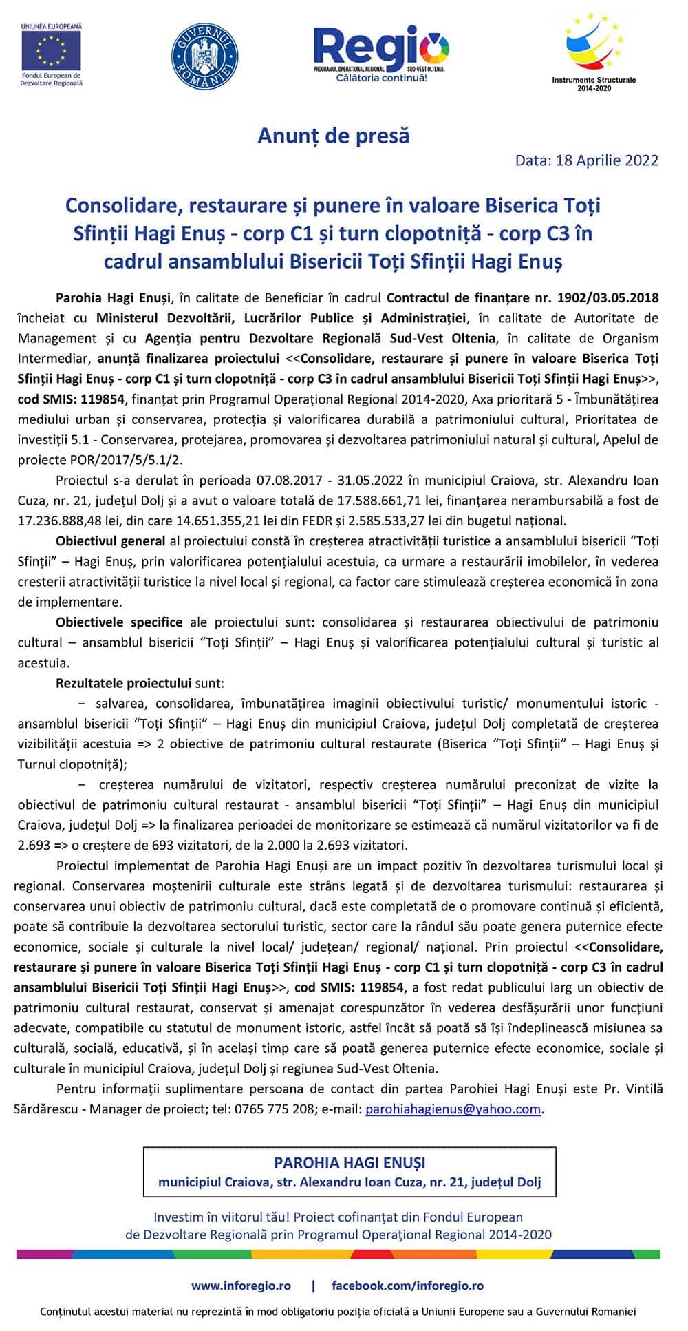 Parohia Hagi Enuși, în calitate de Beneficiar în cadrul Contractul de finanțare nr. 1902/03.05.2018 încheiat cu Ministerul Dezvoltării, Lucrărilor Publice și Administrației, în calitate de Autoritate de Management și cu Agenția pentru Dezvoltare Regională Sud-Vest Oltenia, în calitate de Organism Intermediar, anunță finalizarea proiectului <<Consolidare, restaurare și punere în valoare Biserica Toți Sfinții Hagi Enuș - corp C1 și turn clopotniță - corp C3 în cadrul ansamblului Bisericii Toți Sfinții Hagi Enuș>>, cod SMIS: 119854, finanțat prin Programul Operațional Regional 2014-2020, Axa prioritară 5 - Îmbunătățirea mediului urban și conservarea, protecția și valorificarea durabilă a patrimoniului cultural, Prioritatea de investiții 5.1 - Conservarea, protejarea, promovarea și dezvoltarea patrimoniului natural și cultural, Apelul de proiecte POR/2017/5/5.1/2.