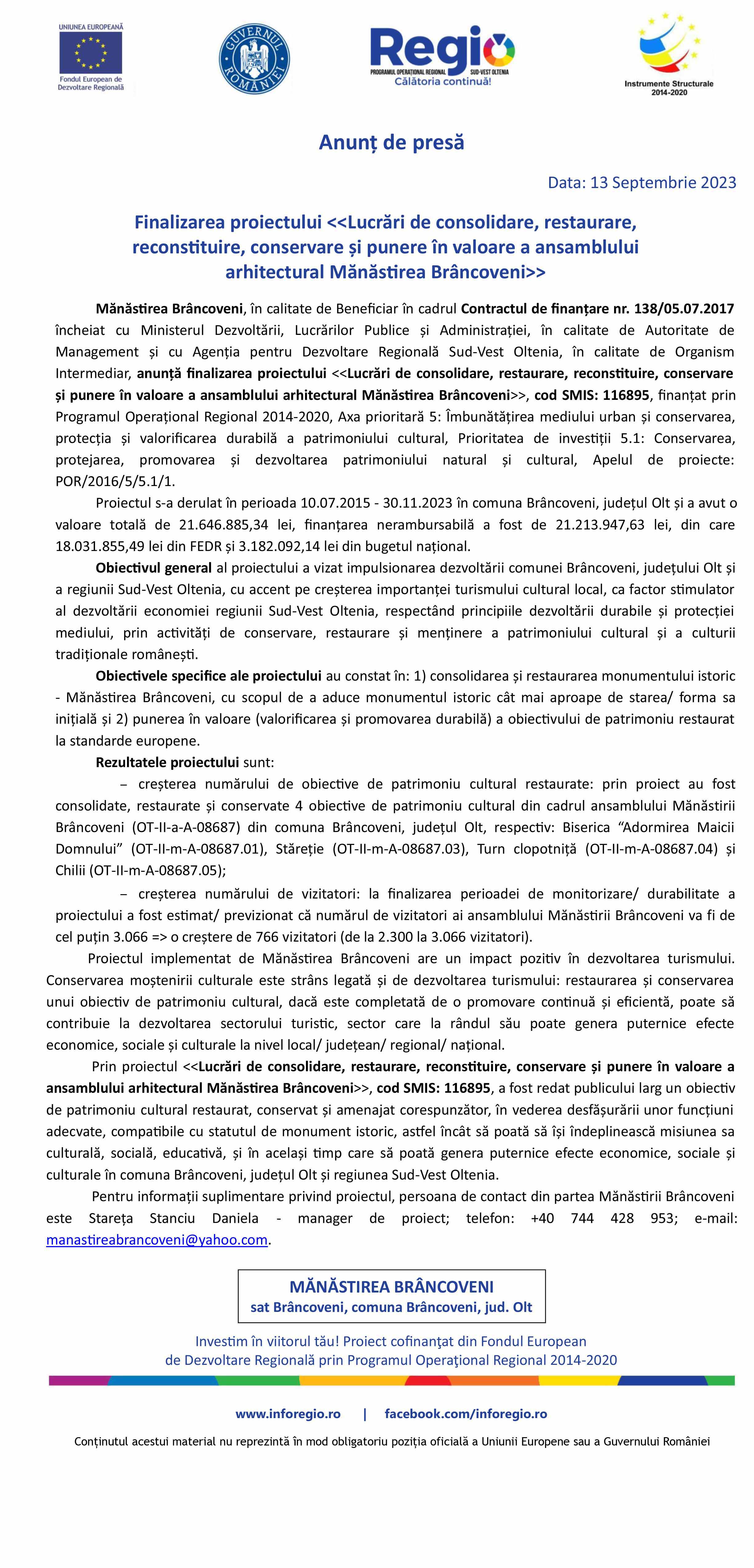 Mănăstirea Brâncoveni, în calitate de Beneficiar în cadrul Contractul de finanțare nr. 138/05.07.2017 încheiat cu Ministerul Dezvoltării, Lucrărilor Publice și Administrației, în calitate de Autoritate de Management și cu Agenția pentru Dezvoltare Regională Sud-Vest Oltenia, în calitate de Organism Intermediar, anunță finalizarea proiectului <<Lucrări de consolidare, restaurare, reconstituire, conservare și punere în valoare a ansamblului arhitectural Mănăstirea Brâncoveni>>, cod SMIS: 116895, finanțat prin Programul Operațional Regional 2014-2020, Axa prioritară 5: Îmbunătățirea mediului urban și conservarea, protecția și valorificarea durabilă a patrimoniului cultural, Prioritatea de investiții 5.1: Conservarea, protejarea, promovarea și dezvoltarea patrimoniului natural și cultural, Apelul de proiecte: POR/2016/5/5.1/1.