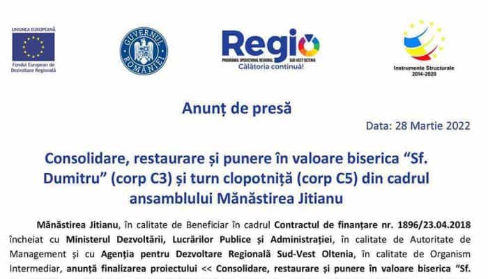 Anunț de presă: Consolidare, restaurare și punere în valoare biserica “Sf. Dumitru” (corp C3) și turn clopotniță (corp C5) din cadrul ansamblului Mănăstirea Jitianu