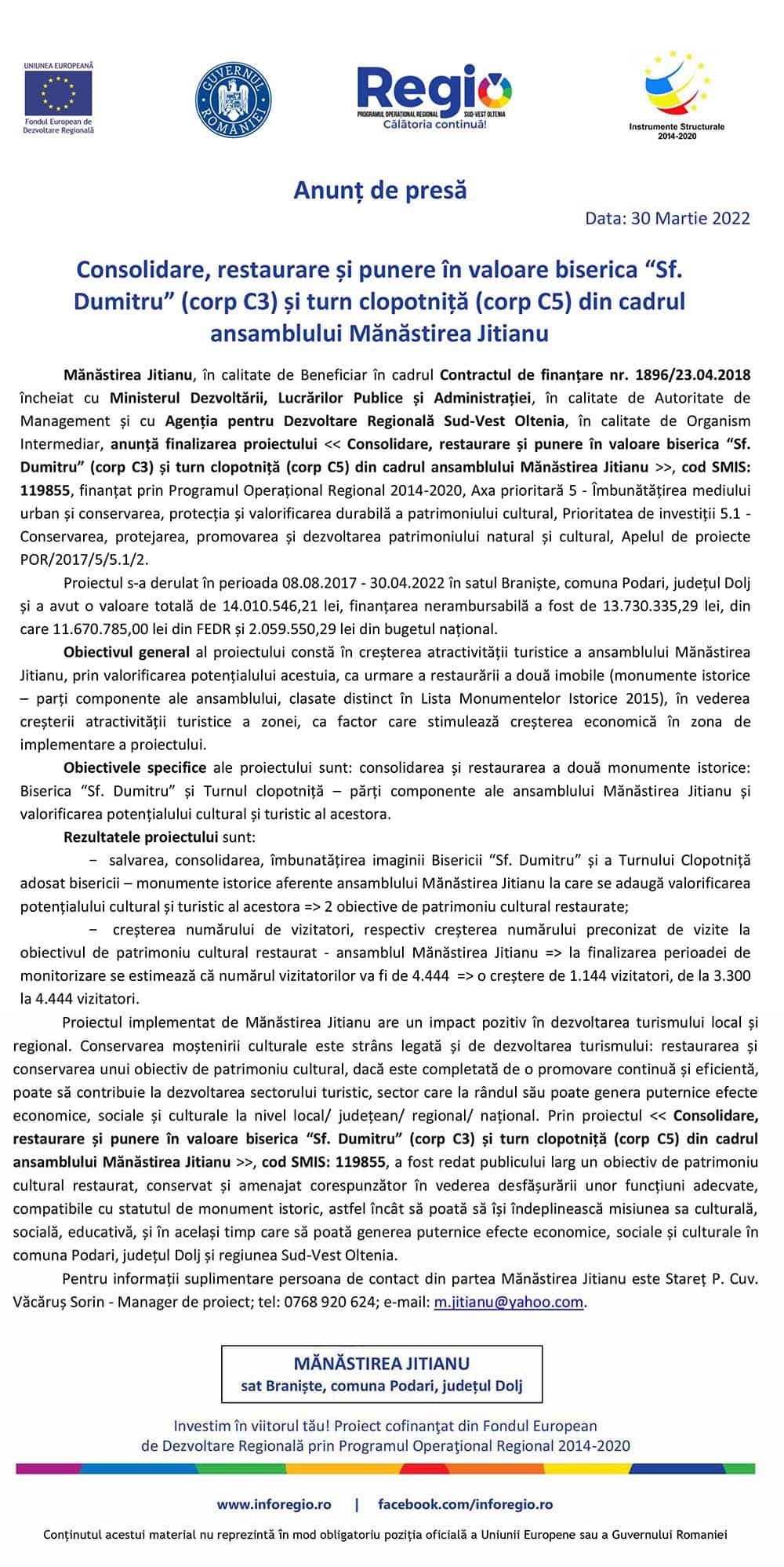 Mănăstirea Jitianu, în calitate de Beneficiar în cadrul Contractul de finanțare nr. 1896/23.04.2018 încheiat cu Ministerul Dezvoltării, Lucrărilor Publice și Administrației, în calitate de Autoritate de Management și cu Agenția pentru Dezvoltare Regională Sud-Vest Oltenia, în calitate de Organism Intermediar, anunță finalizarea proiectului << Consolidare, restaurare și punere în valoare biserica Sf. Dumitru (corp C3) și turn clopotniță (corp C5) din cadrul ansamblului Mănăstirea Jitianu >>, cod SMIS: 119855, finanțat prin Programul Operațional Regional 2014-2020, Axa prioritară 5 - Îmbunătățirea mediului urban și conservarea, protecția și valorificarea durabilă a patrimoniului cultural, Prioritatea de investiții 5.1 - Conservarea, protejarea, promovarea și dezvoltarea patrimoniului natural și cultural, Apelul de proiecte POR/2017/5/5.1/2.
