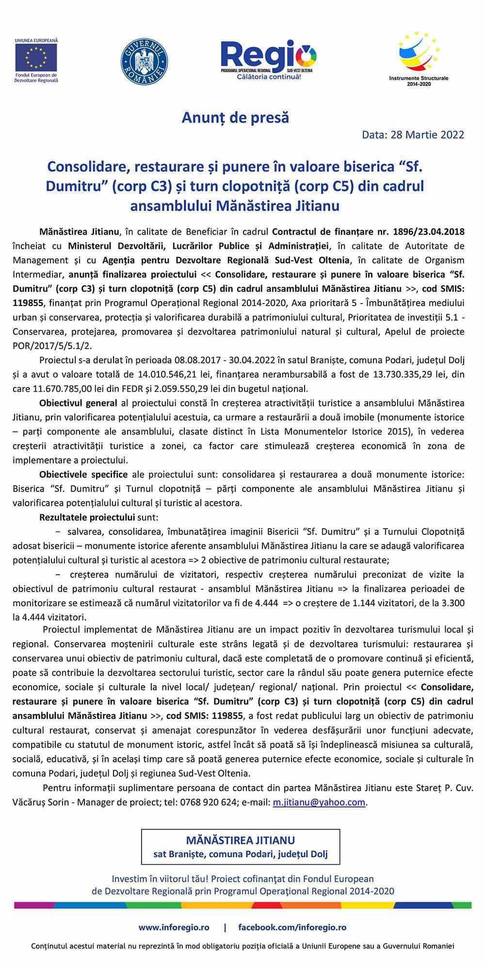 Mănăstirea Jitianu, în calitate de Beneficiar în cadrul Contractul de finanțare nr. 1896/23.04.2018 încheiat cu Ministerul Dezvoltării, Lucrărilor Publice și Administrației, în calitate de Autoritate de Management și cu Agenția pentru Dezvoltare Regională Sud-Vest Oltenia, în calitate de Organism Intermediar, anunță finalizarea proiectului << Consolidare, restaurare și punere în valoare biserica “Sf. Dumitru” (corp C3) și turn clopotniță (corp C5) din cadrul ansamblului Mănăstirea Jitianu >>, cod SMIS: 119855, finanțat prin Programul Operațional Regional 2014-2020, Axa prioritară 5 - Îmbunătățirea mediului urban și conservarea, protecția și valorificarea durabilă a patrimoniului cultural, Prioritatea de investiții 5.1 - Conservarea, protejarea, promovarea și dezvoltarea patrimoniului natural și cultural, Apelul de proiecte POR/2017/5/5.1/2.