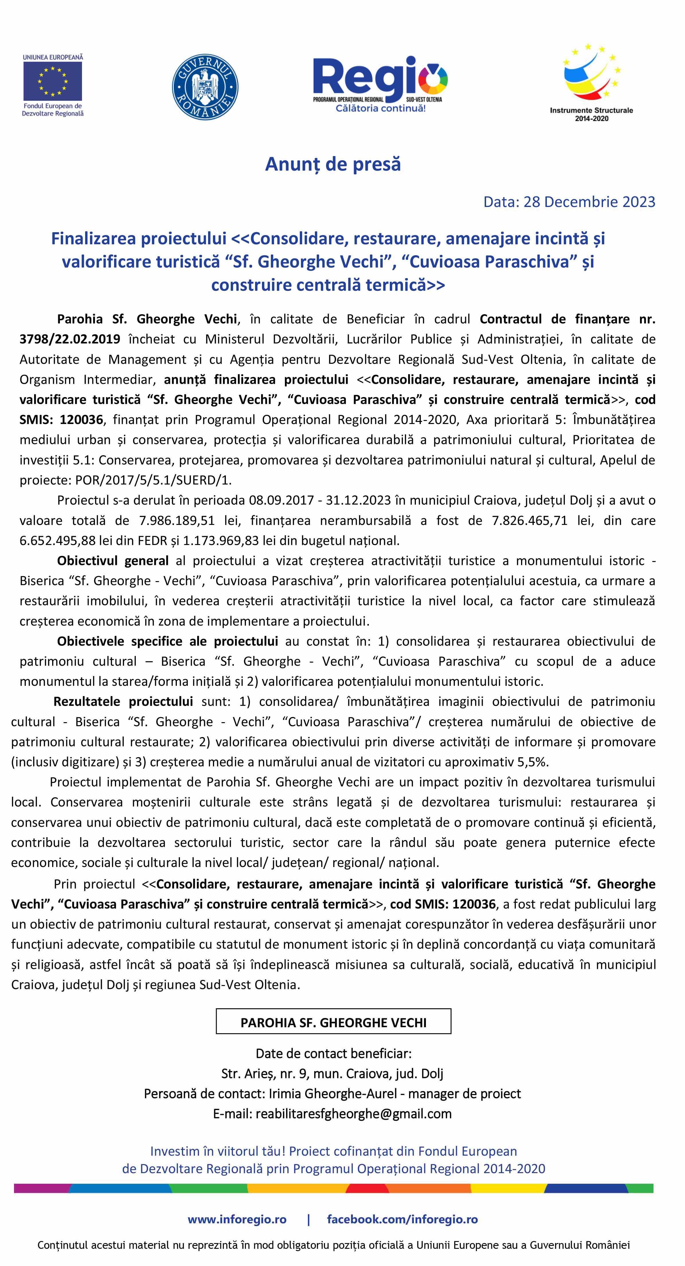 Parohia Sf. Gheorghe Vechi, în calitate de Beneficiar în cadrul Contractul de finanțare nr. 3798/22.02.2019 încheiat cu Ministerul Dezvoltării, Lucrărilor Publice și Administrației, în calitate de Autoritate de Management și cu Agenția pentru Dezvoltare Regională Sud-Vest Oltenia, în calitate de Organism Intermediar, anunță finalizarea proiectului <<Consolidare, restaurare, amenajare incintă și valorificare turistică “Sf. Gheorghe Vechi”, “Cuvioasa Paraschiva” și construire centrală termică>>, cod SMIS: 120036, finanțat prin Programul Operațional Regional 2014-2020, Axa prioritară 5: Îmbunătățirea mediului urban și conservarea, protecția și valorificarea durabilă a patrimoniului cultural, Prioritatea de investiții 5.1: Conservarea, protejarea, promovarea și dezvoltarea patrimoniului natural și cultural, Apelul de proiecte: POR/2017/5/5.1/SUERD/1.