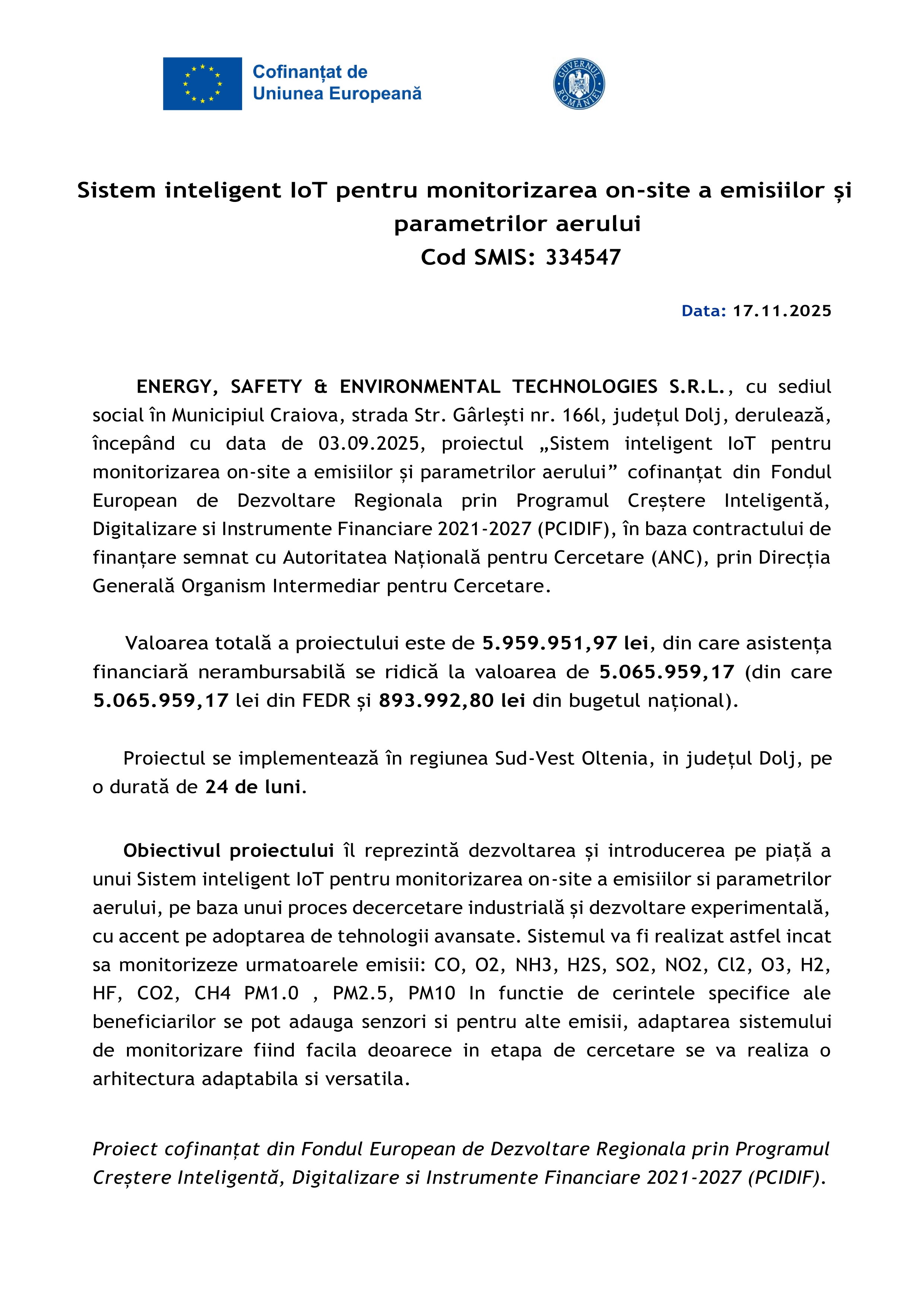 ENERGY, SAFETY & ENVIRONMENTAL TECHNOLOGIES S.R.L. - Sistem inteligent IoT pentru monitorizarea on-site a emisiilor și parametrilor aerului - Cod SMIS: 334547
