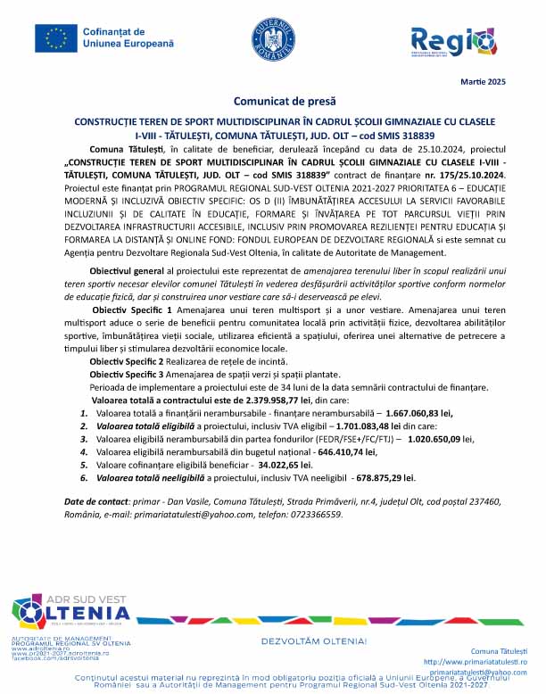 Comuna Tătulești, în calitate de beneficiar, derulează începând cu data de 25.10.2024, proiectul „CONSTRUCTIE TEREN DE SPORT MULTIDISCIPLINAR IN CADRUL SCOLII GIMNAZIALE CU CLASELE I-VIII - TĂTULEȘTI, COMUNA TĂTULEȘTI, JUD. OLT – cod SMIS 318839” contract de finanțare nr. 175/25.10.2024. Proiectul este finanțat prin PROGRAMUL REGIONAL SUD-VEST OLTENIA 2021-2027 PRIORITATEA 6 – EDUCAȚIE MODERNĂ ȘI INCLUZIVĂ OBIECTIV SPECIFIC: OS D (II) ÎMBUNĂTĂȚIREA ACCESULUI LA SERVICII FAVORABILE INCLUZIUNII ȘI DE CALITATE ÎN EDUCAȚIE, FORMARE ȘI ÎNVĂȚAREA PE TOT PARCURSUL VIEȚII PRIN DEZVOLTAREA INFRASTRUCTURII ACCESIBILE, INCLUSIV PRIN PROMOVAREA REZILIENȚEI PENTRU EDUCAȚIA ȘI FORMAREA LA DISTANȚĂ ȘI ONLINE FOND: FONDUL EUROPEAN DE DEZVOLTARE REGIONALĂ si este semnat cu Agenția pentru Dezvoltare Regionala Sud-Vest Oltenia, în calitate de Autoritate de Management.