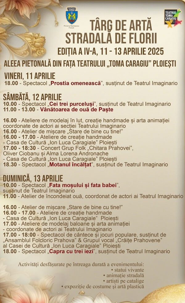 În așteptarea festivalului, weekend-ul acesta, cei mici se pot bucura de a patra ediție a Târgului de artă stradală de Florii, o altă frumoasă tradiție din calendarul Teatrului „Toma Caragiu” Ploiești: