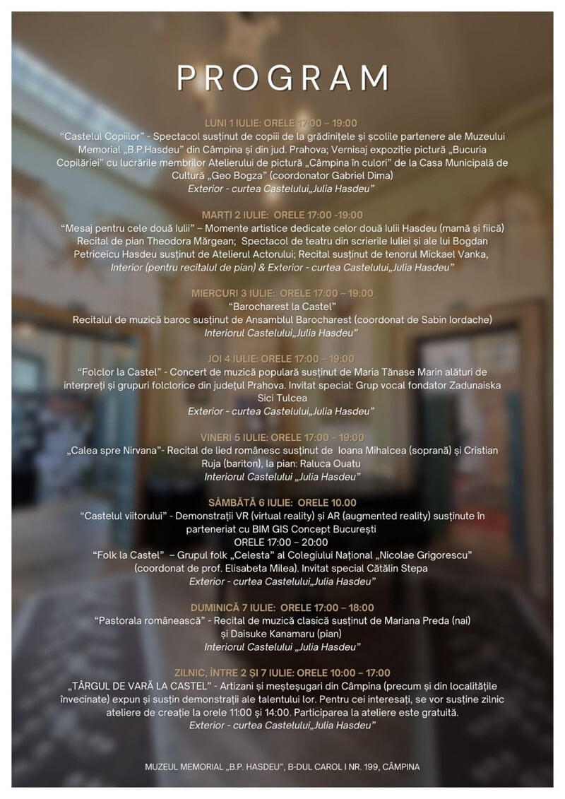 În afară de momentele artistice programate la Câmpina, în perioada 1-7 iulie, conducerea Muzeului a pregătit, în cadrul Sărbătorii Castelului celor 2 Iulii, un târg de vară care va reuni meștșugari și artizani din zonă, iar zilnic, începând cu 2 iulie, vor fi organizate și ateliere de creație.