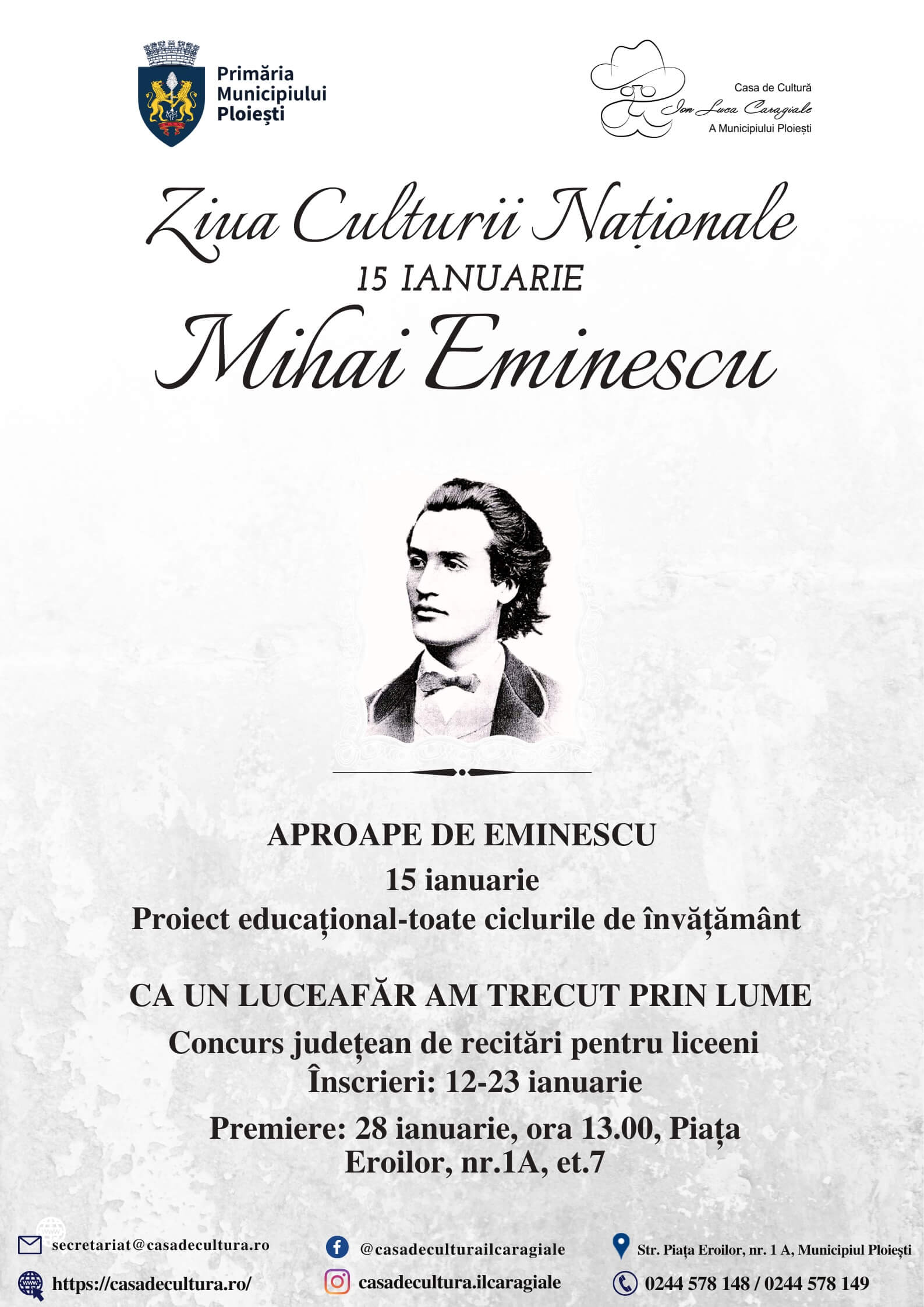 Casa de Cultură „Ion Luca Caragiale” a Municipiului Ploiești marchează Ziua Culturii Naționale printr-o serie de evenimente culturale și educaționale dedicate poetului național Mihai Eminescu.