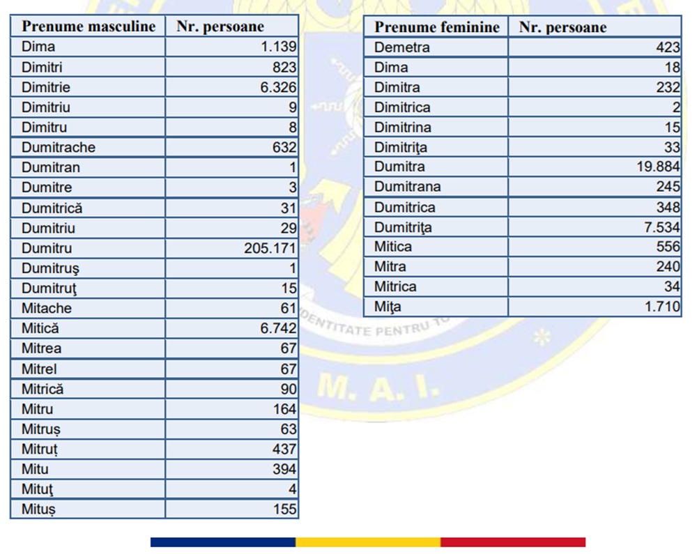 222.432 de români și 31.247 de românce își sărbătoresc astăzi onomastica. Aproximativ 205.000 de sărbătoriți au prenumele Dumitru, aproape 20.000 de femei se numesc Dumitra, iar restul poartă nume derivate din acestea: