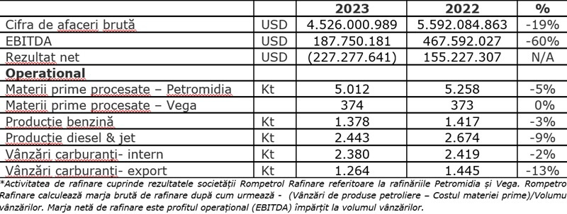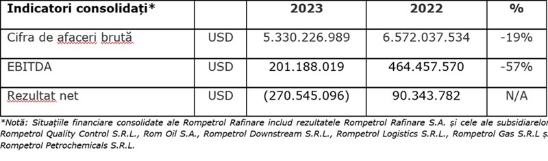 Rompetrol Rafinare, companie membră a Grupului KMG International, a înregistrat, în 2023, o scădere a indicatorilor financiari, pe fondul volatilității cotațiilor internaționale la țiței și produse rafinate. Acestea și-au continuat trendul descendent, atingând în 2023 o scădere de 14% la benzină și 21% la motorină. Cifra de afaceri brută a fost, anul trecut de 5,3 miliarde de dolari, în 2023, scădere de 19% comparativ cu anul precedent, profitul operațional (EBITDA) a fost de 201 milioane de dolari, iar rezultatul net a fost unul negativ, de 270,5 milioane de dolari, reiese din bilanțul prezentat de reprezentanții companiei.