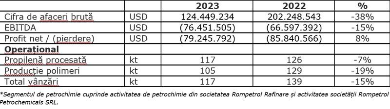 Segmentul de petrochimie a procesat, anul trecut, 135 de mii de tone de materii prime (propilenă și etilenă), în scădere cu aproximativ 20% față de nivelul din 2022, anunță compania în comunicatul referitor la rezultatele înregistrate pe parcursul anului trecut. Producția totală de polimeri a Diviziei de Petrochimie a fost de 105 kt în 2023, în scădere cu 19% față de 2022, nivel influențat, în principal, de instalația de Polietilene de Joasă Densitate (LDPE), care nu a funcționat continuu, din cauza condițiilor nefavorabile de pe piața produselor petrochimice. Prin activitatea operațională din 2023, singurul producător intern de polimeri a continuat să-și onoreze livrările către partenerii din industriile de profil și a susținut, pe orizontală, diverse sectoare de producție.