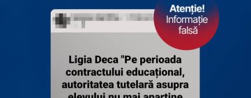 Fake-news distribuit pe reţelele sociale: O declaraţie atribuită ministului Ligia Deca susţine că ”pe durata contractului educaţional, autoritatea tutelară nu mai aparţine părinţilor”