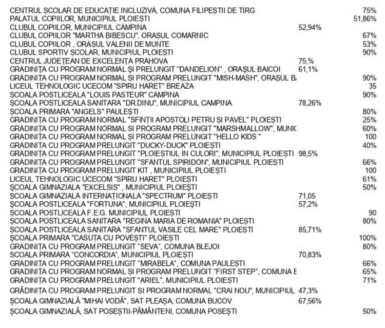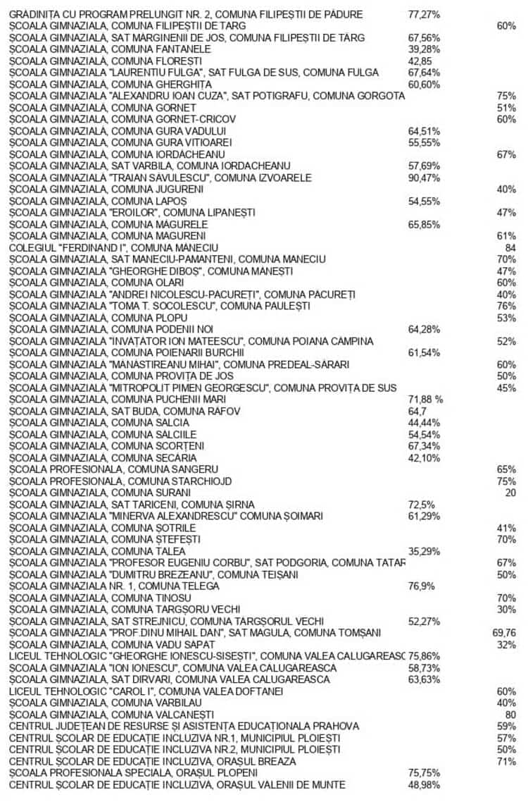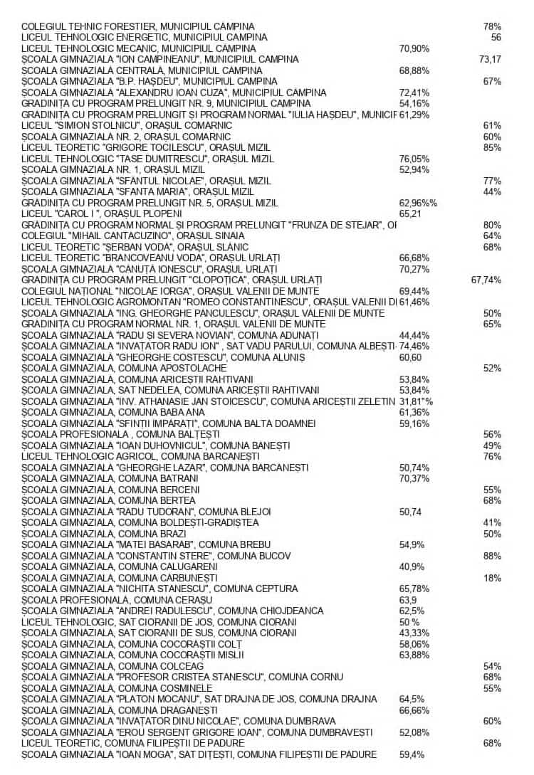 Inspectoratul Școlar Județean Prahova a publicat, vineri după-amiază, rata de vaccinare în fiecare unitate de învățământ preuniversitar din Prahova.