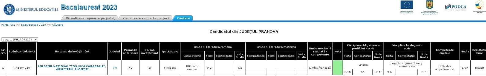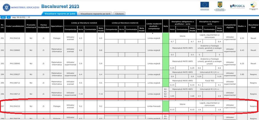 În dreptul acestui cod, rezultatele finale anunță că, după contestație, nota la Istorie a fost modificată din 8,15 în 7,10. Pe de altă parte, apare modificată și nota la ultimă probă, cea la disciplina Logică, de la 1,60 la 9,60. În schimb, sistemul nu arată că în acest caz ar fi fost cerută recorectarea lucrării.